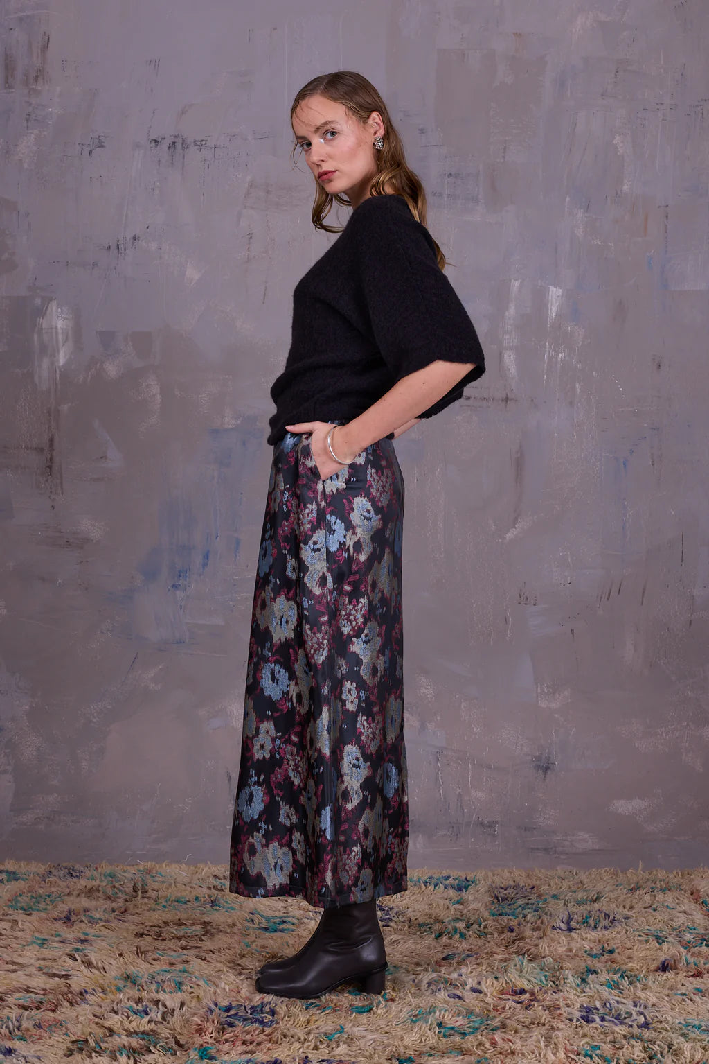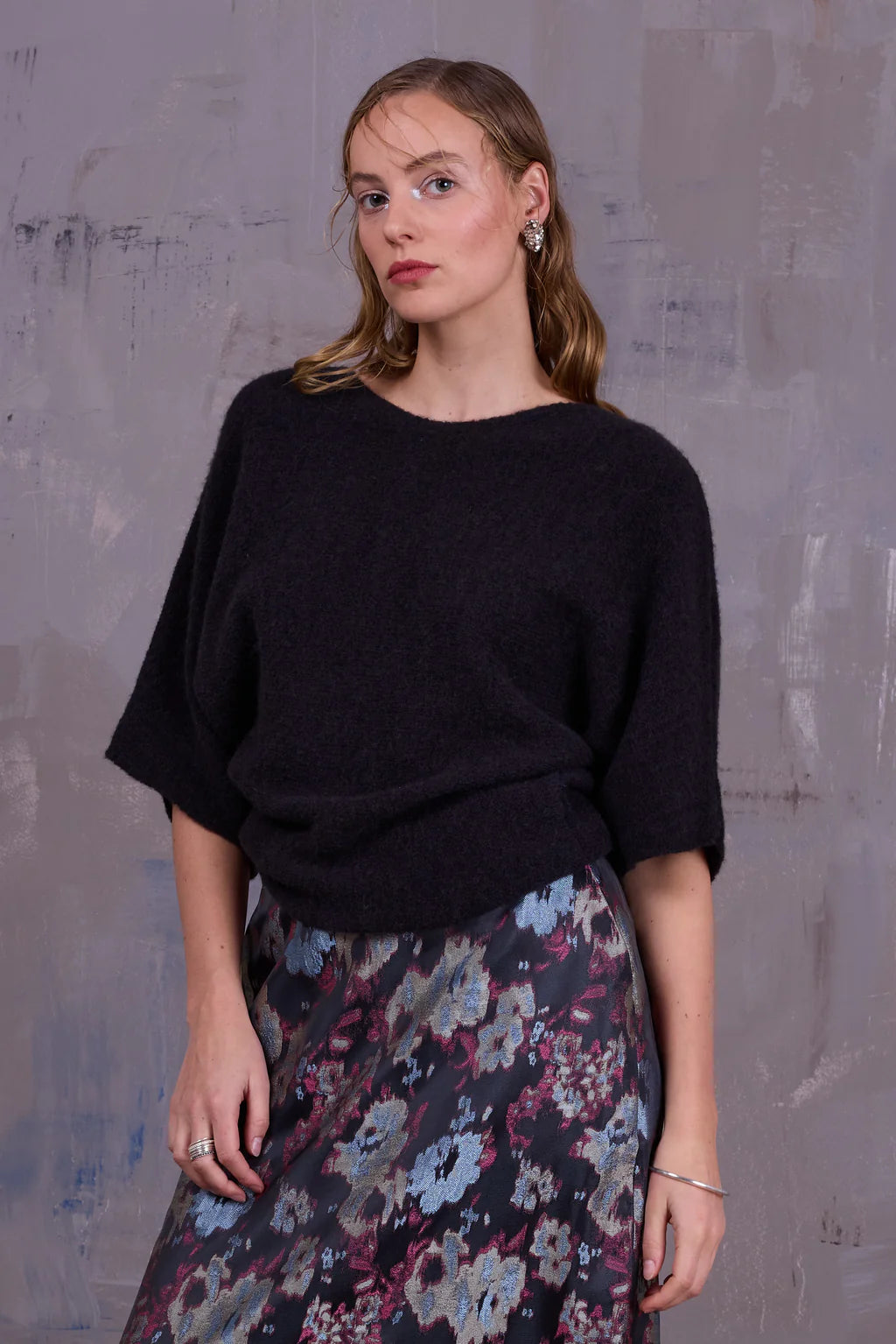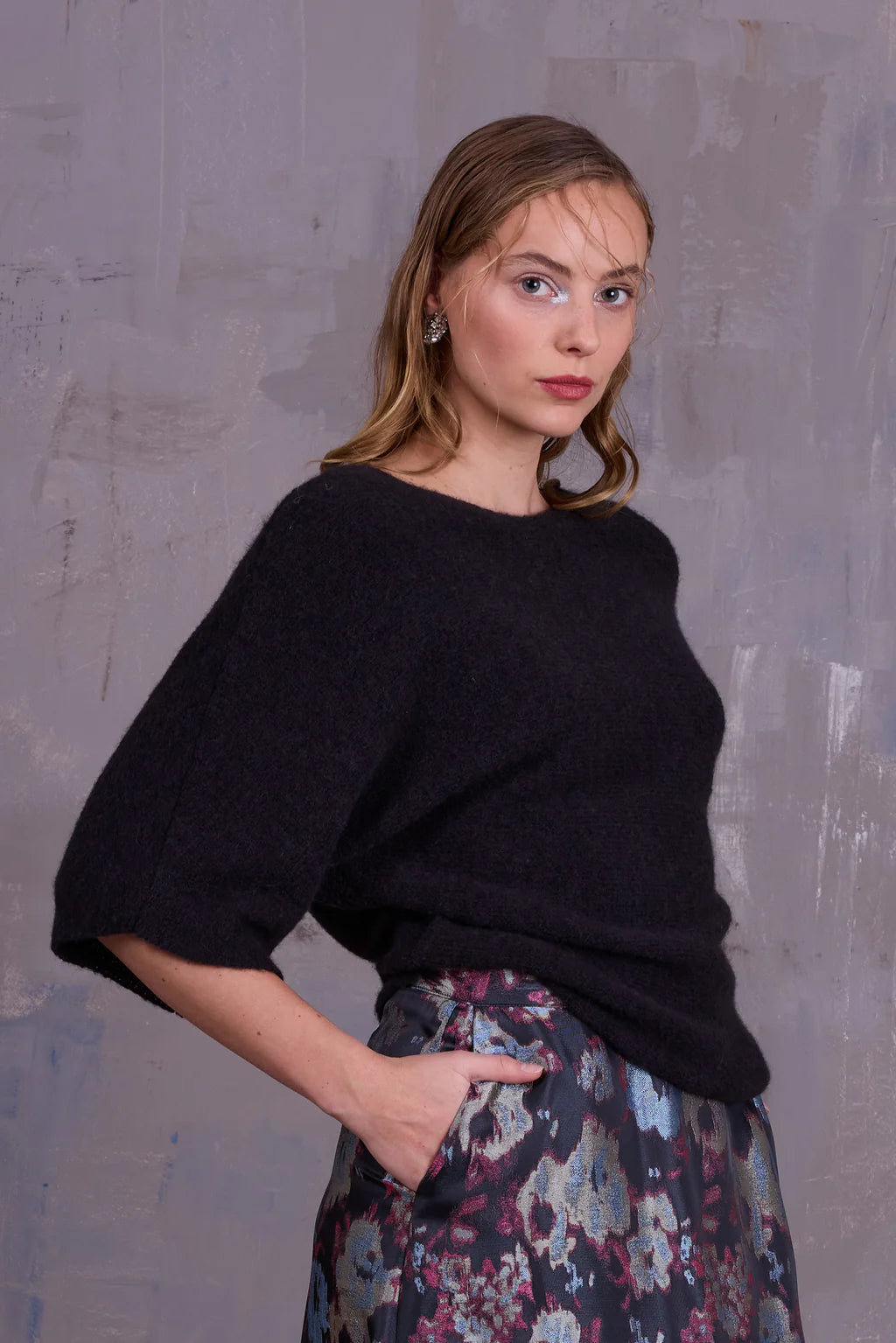 Semi-transparante top in katoen-alpaca wolmix, gebreid in België. Afgewerkt met een boothals en naadloze mouwen. Perfect over een jurk of top met hoge taillebroek.
