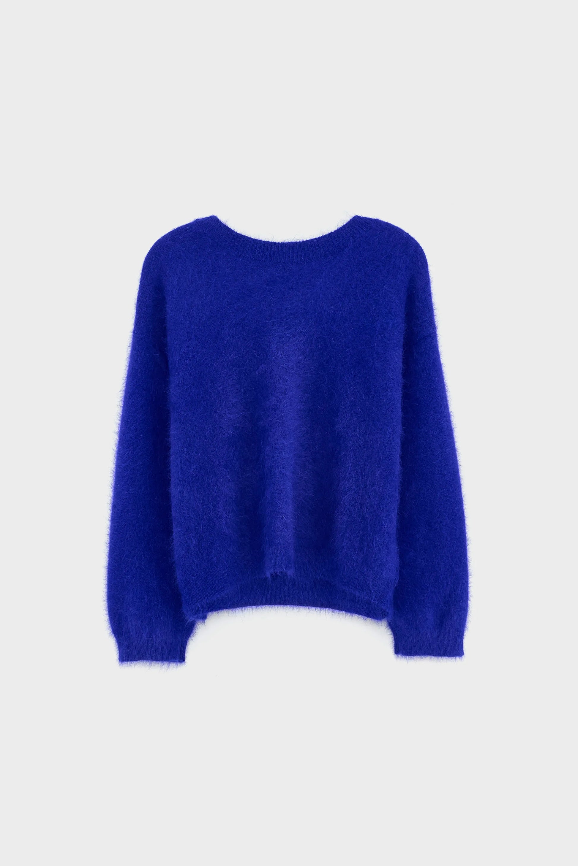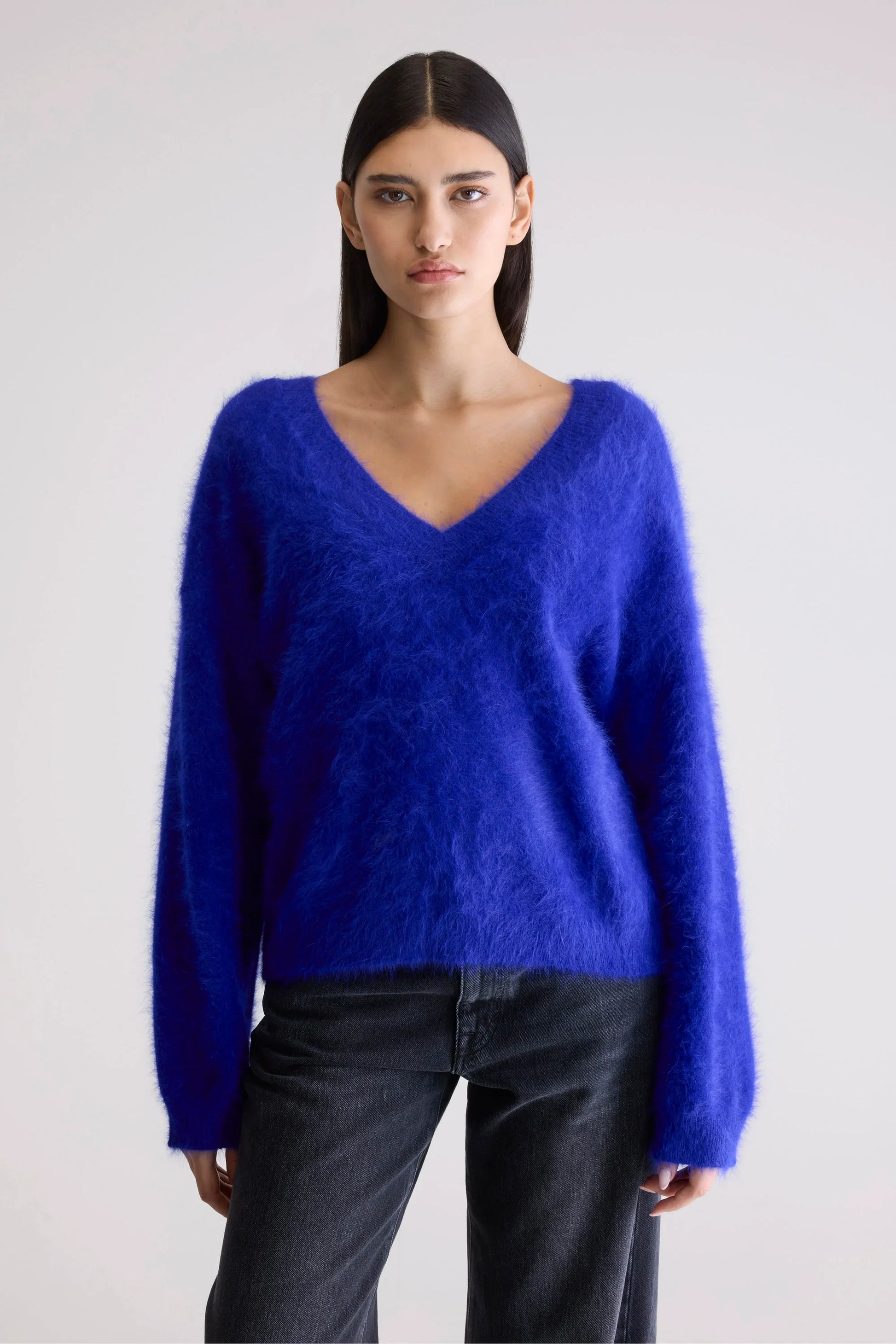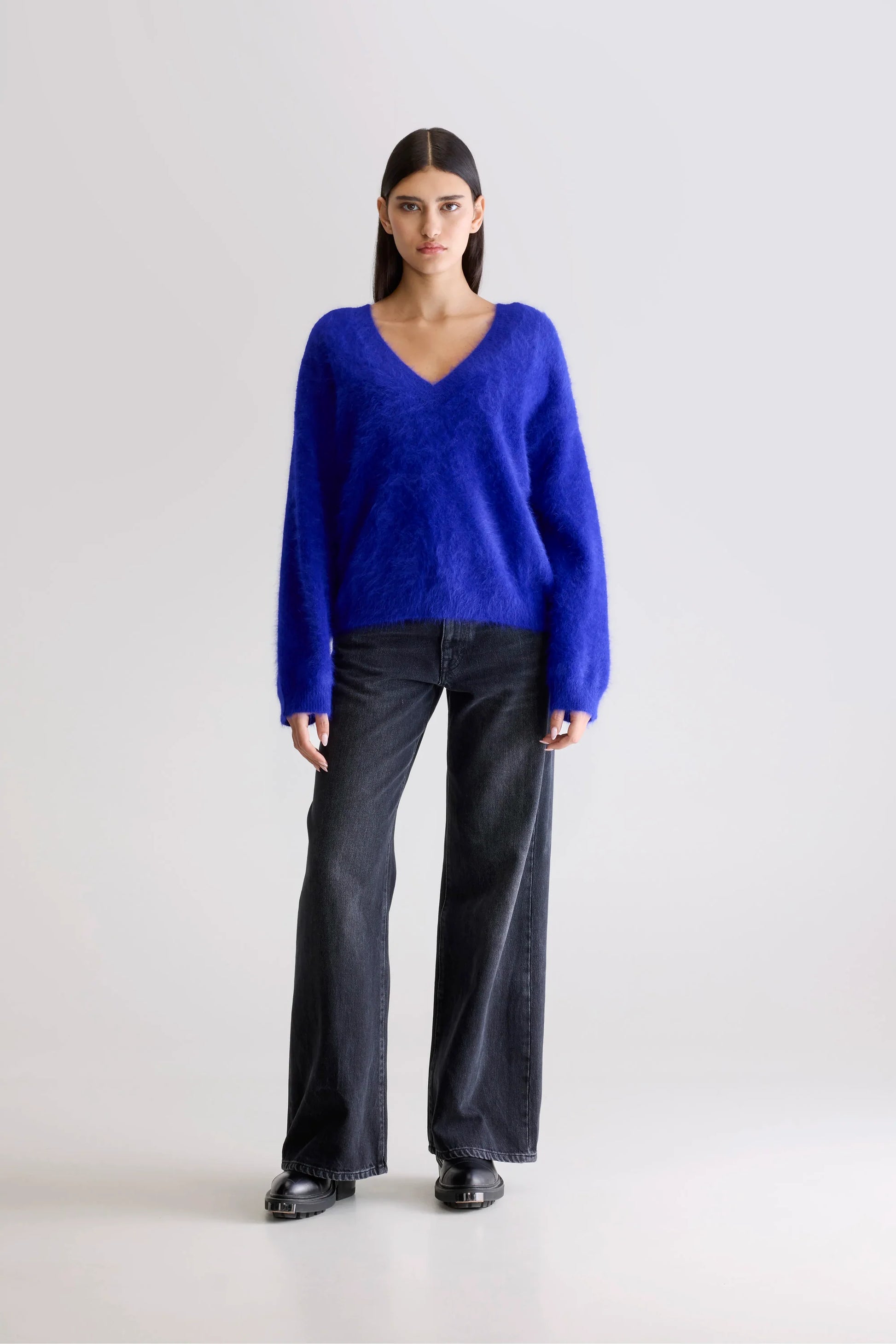Deze oversized trui in dieppaars is gebreid van een zachte angoramix en biedt een luxueuze, cozy feel. Het ontwerp heeft een V-hals en kan zowel met de voor- als achterkant gedragen worden, waardoor je hem op meerdere manieren kunt stylen. De lage schouders, geribde boorden en medium dikte maken dit een veelzijdige knit die moeiteloos elegantie en comfort combineert. Kies je normale maat voor de beoogde oversized look of een maat kleiner voor een meer getailleerde pasvorm.