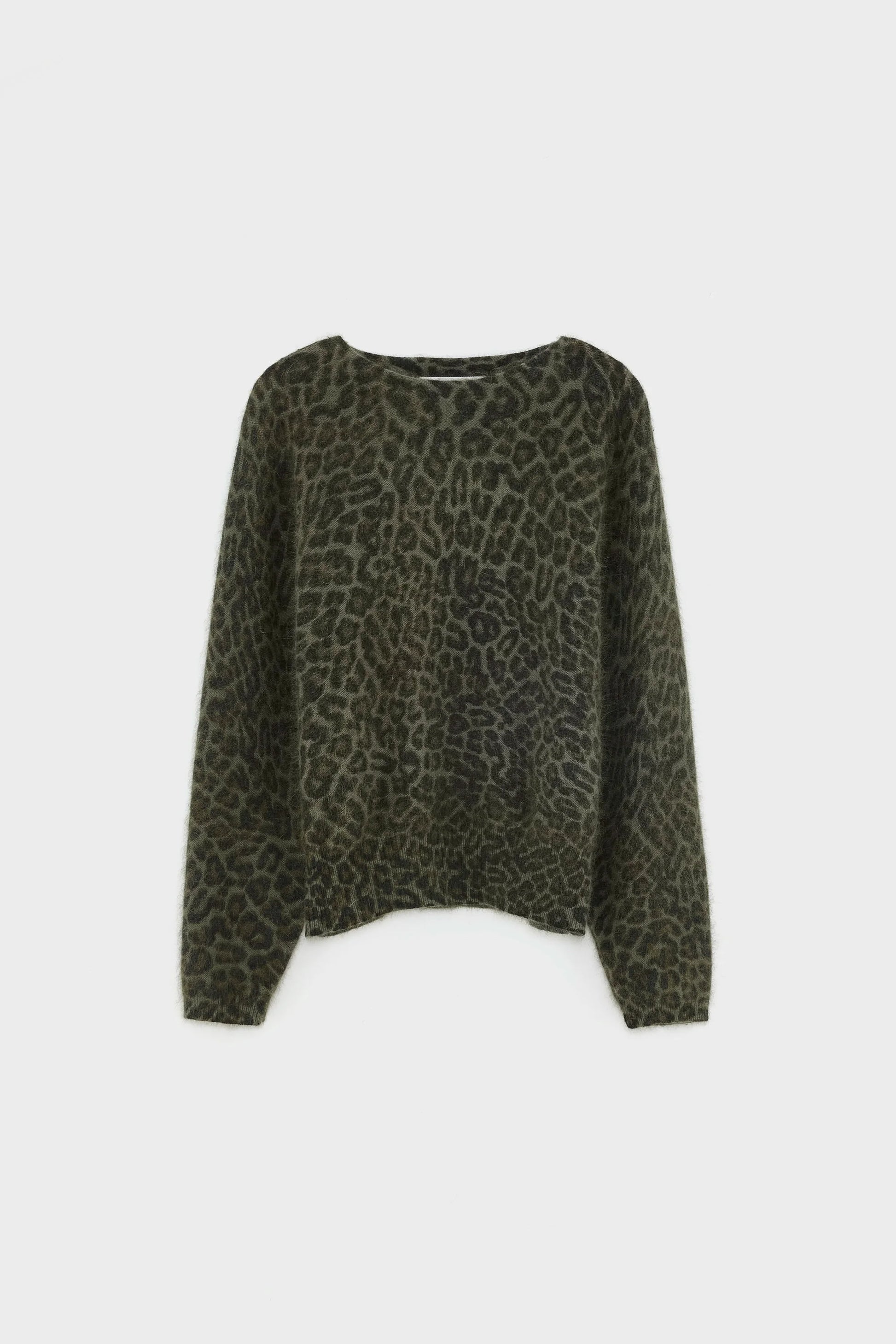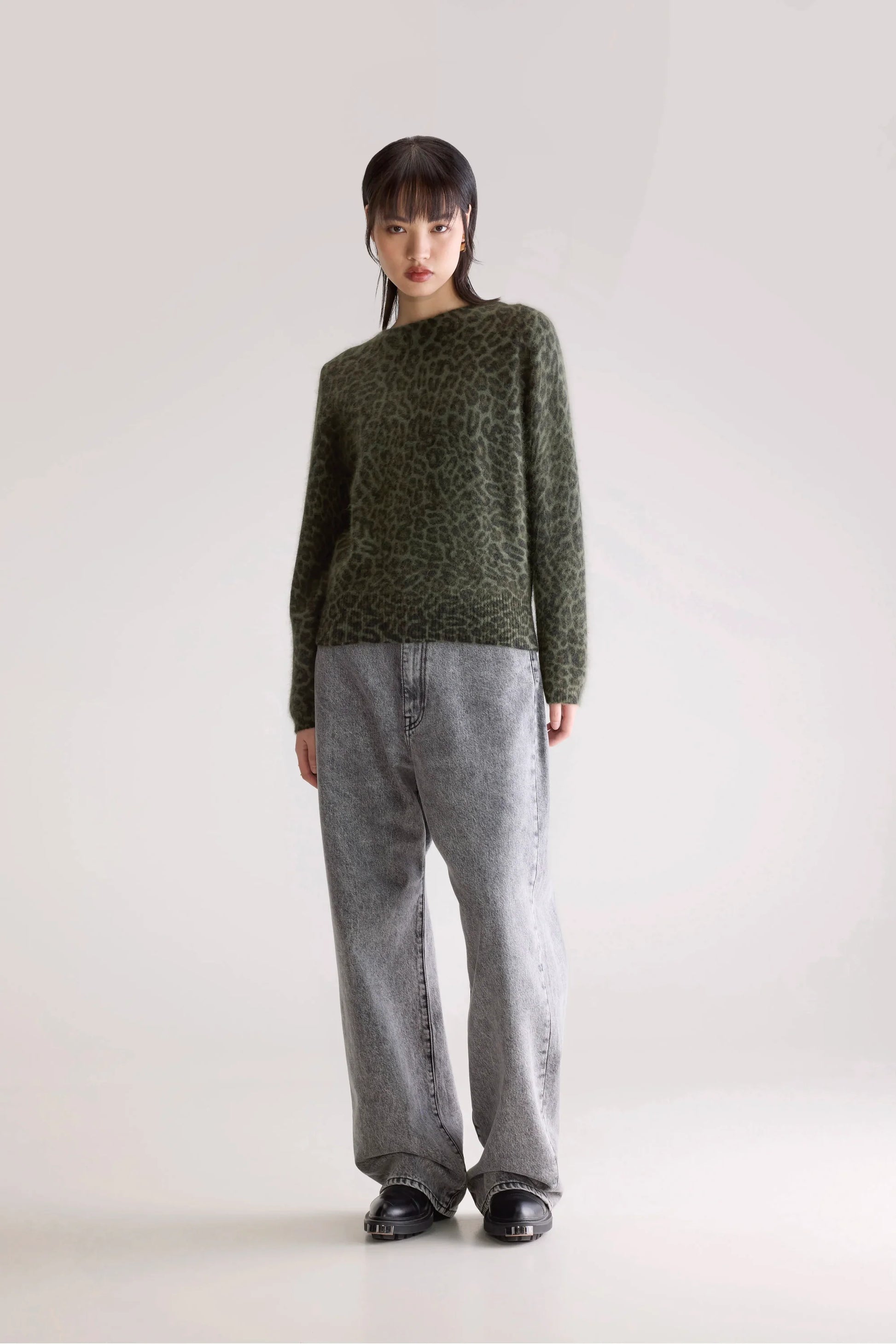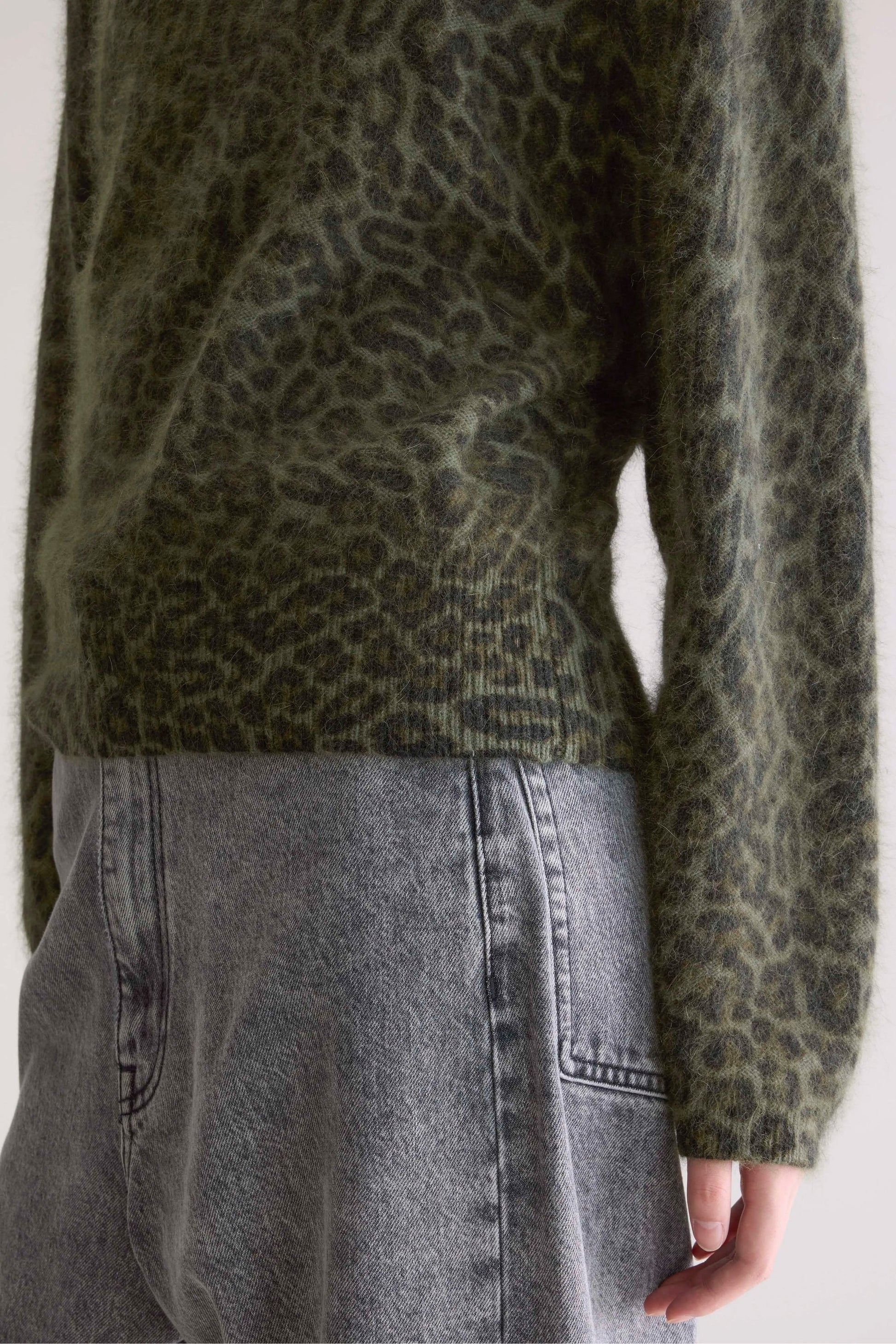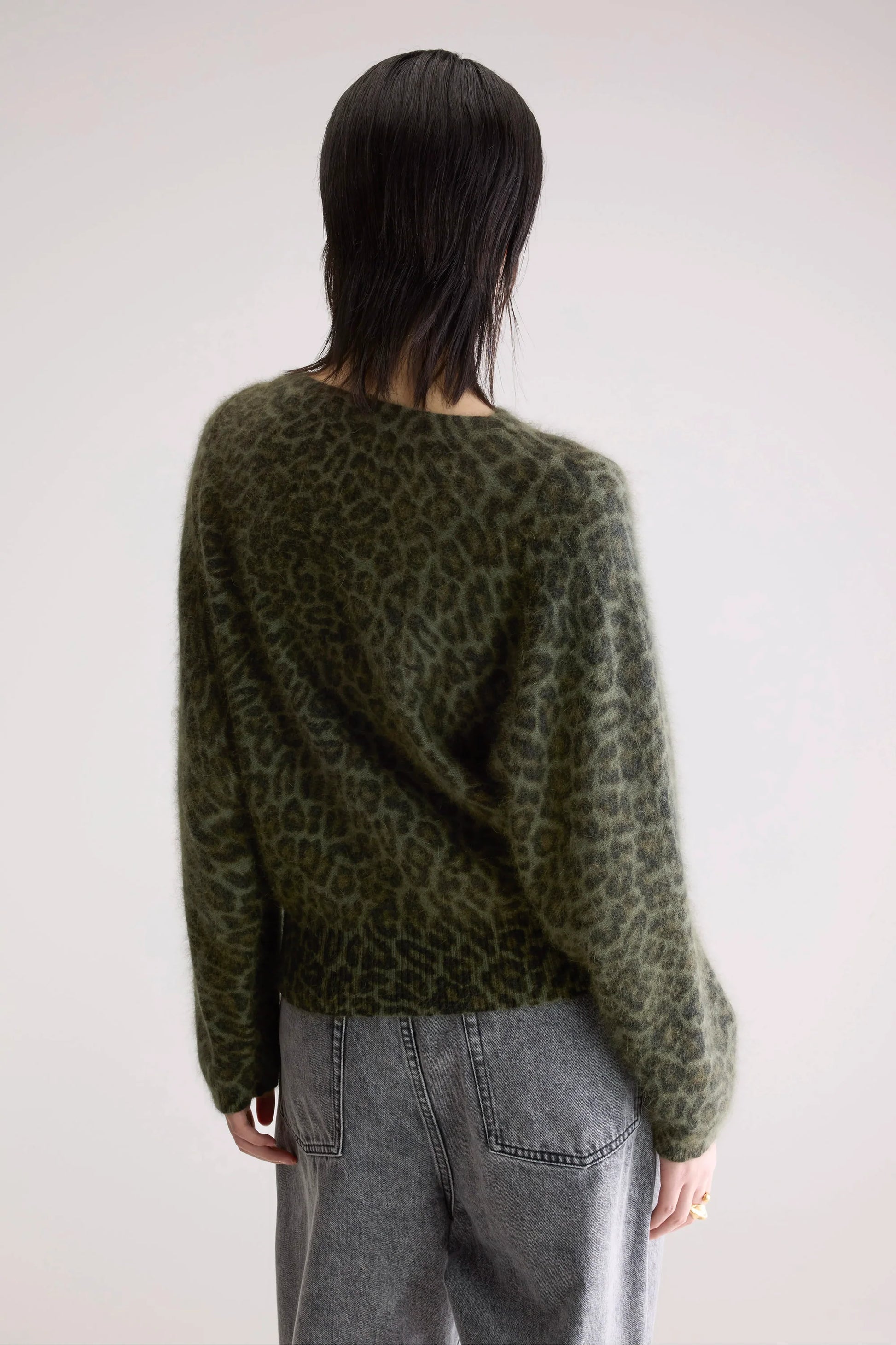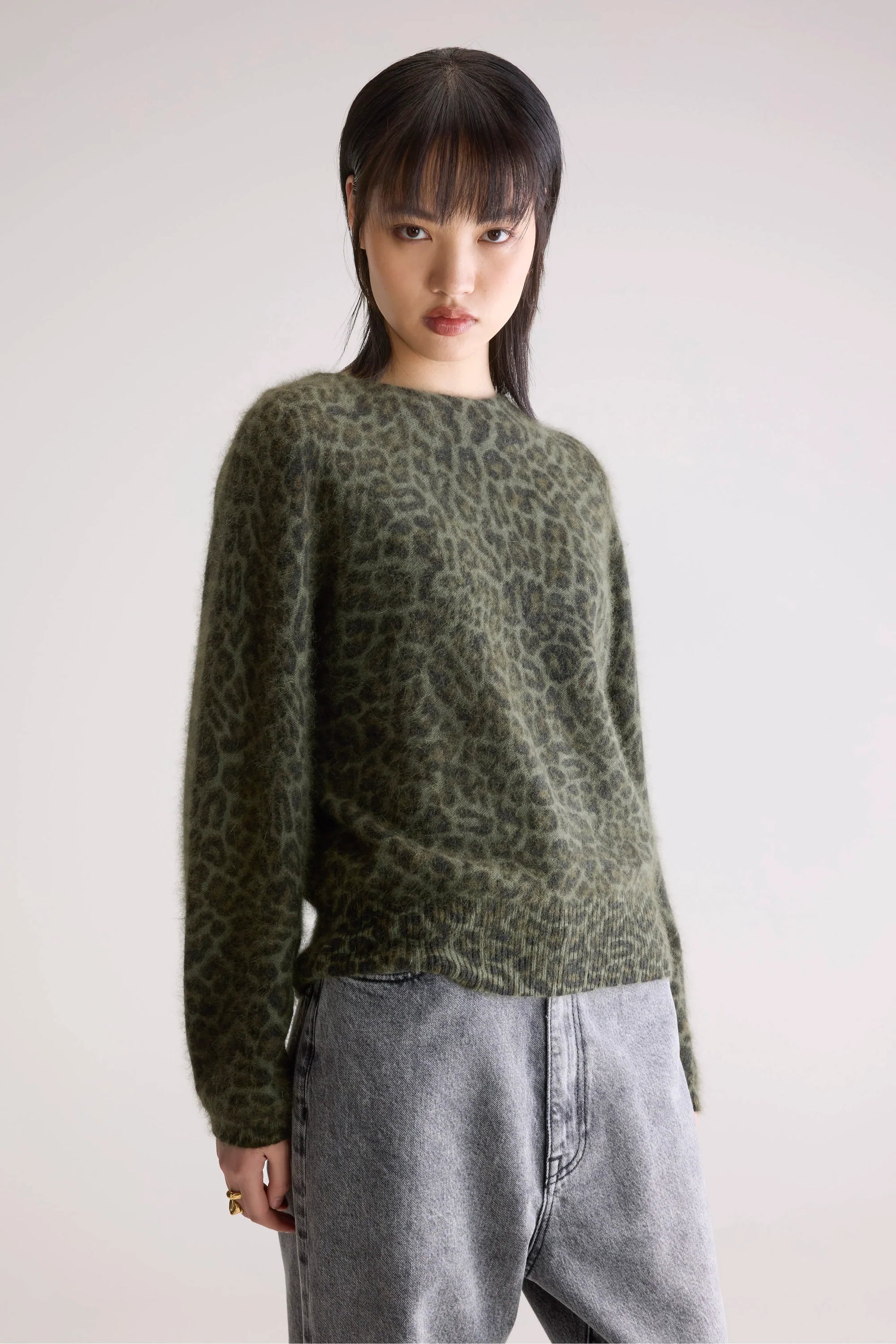 Deze oversized trui met luipaardprint is uitgevoerd in een zachte groene angoramix en voegt een speelse, luxueuze touch toe aan je knitwearcollectie. Het ontwerp heeft een boatneck-halslijn met gevouwen binnenkant, volumineuze mouwen en een all-over luipaardmotief dat omgekeerd is ingebreid voor een subtiel reliëfeffect. Kies je normale maat voor de beoogde oversized look of een maat kleiner voor een meer getailleerde pasvorm.