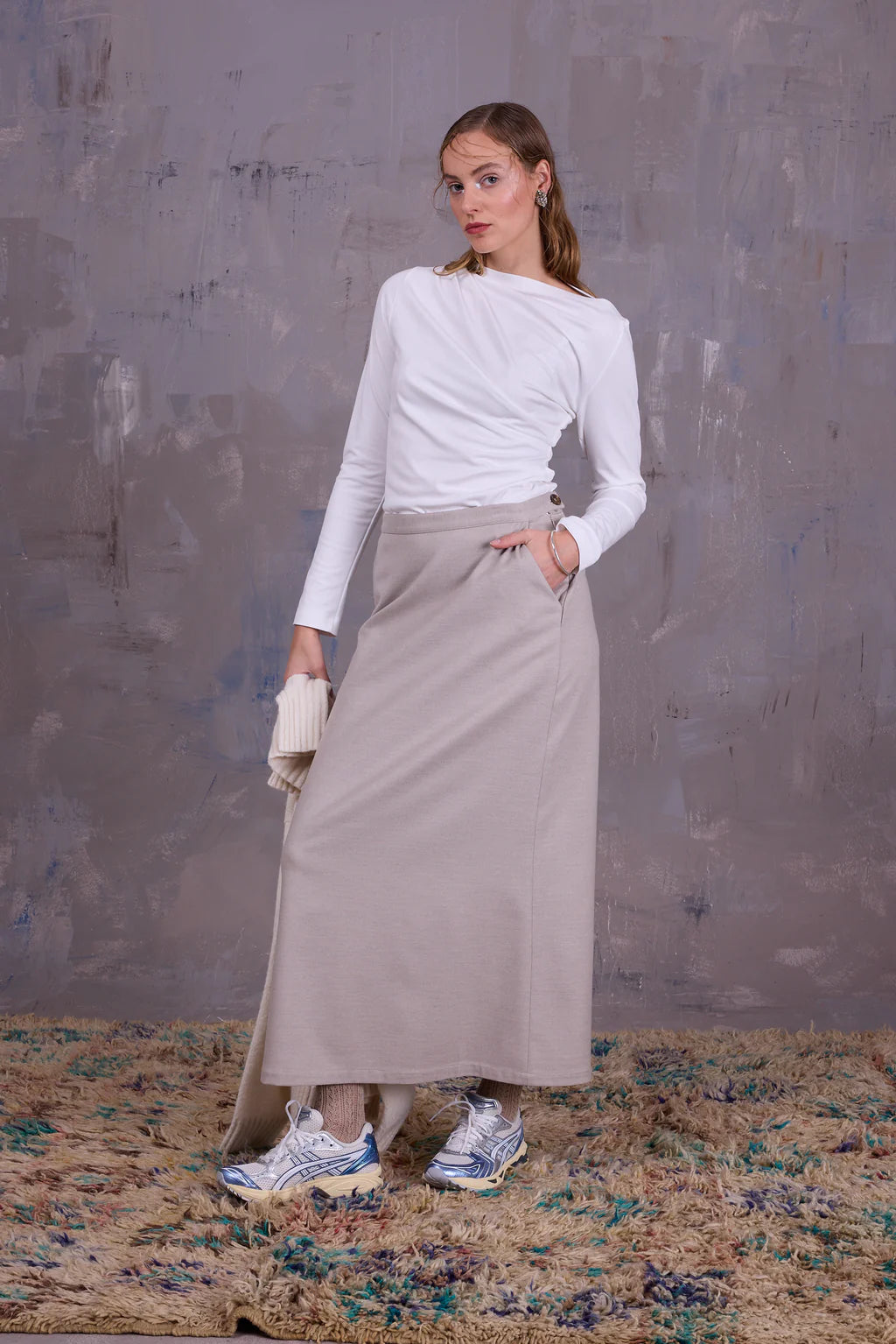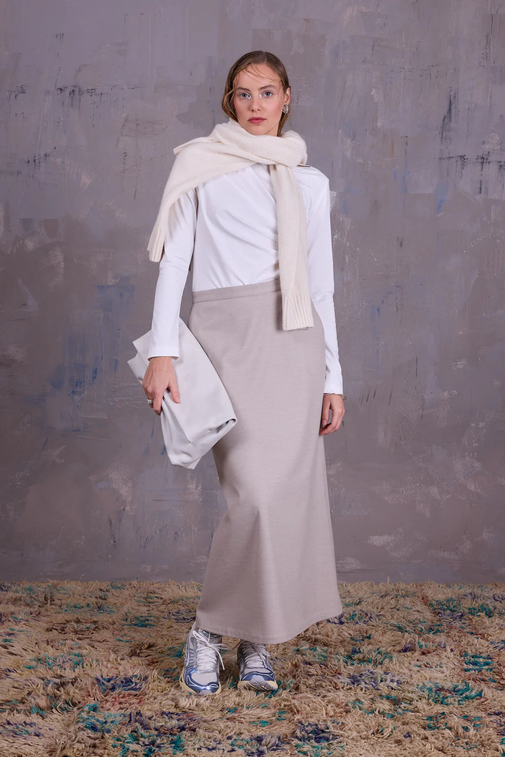 Lange A-lijn rok in een gemêleerde twillstof in donkerblauw met paarse ondertoon, valt soepel en is makkelijk in onderhoud.