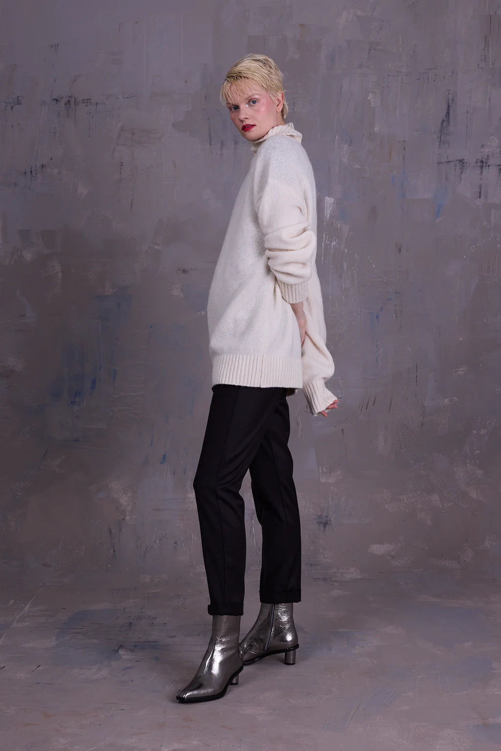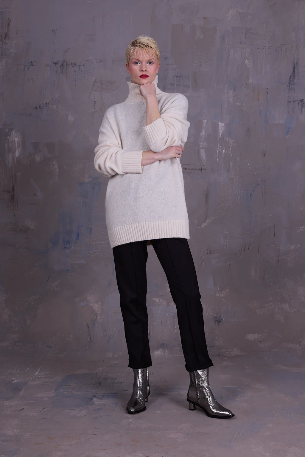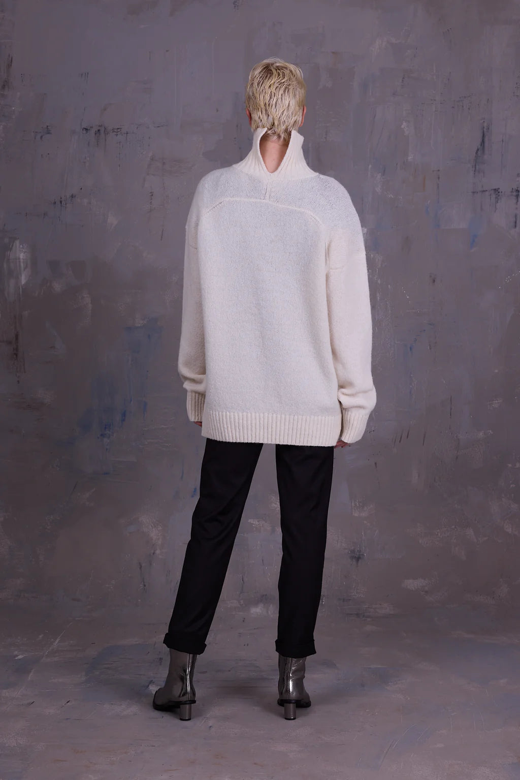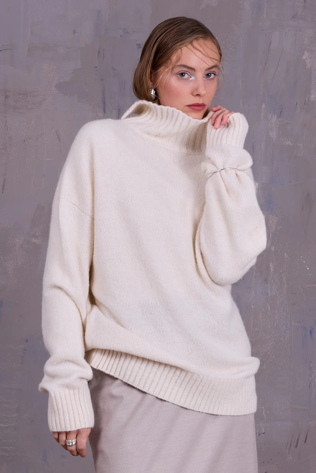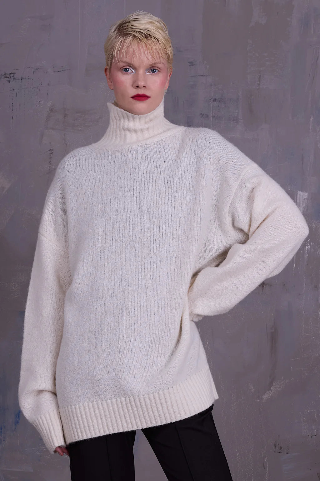Oversized rolkraagtrui met splitdetail in de kraag aan de achterzijde. Het extra lange lijf maakt het een ideaal stuk om te combineren met de Etienne legging of een smalle broek. Gebreid in België in een katoen-alpaca wolmix.