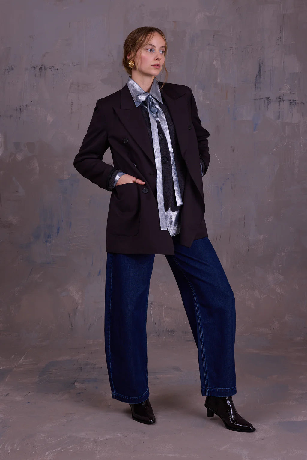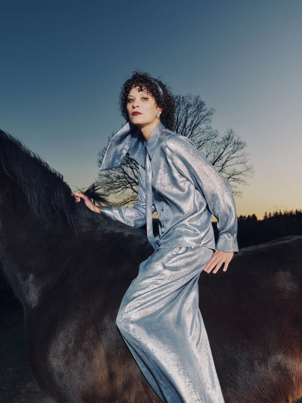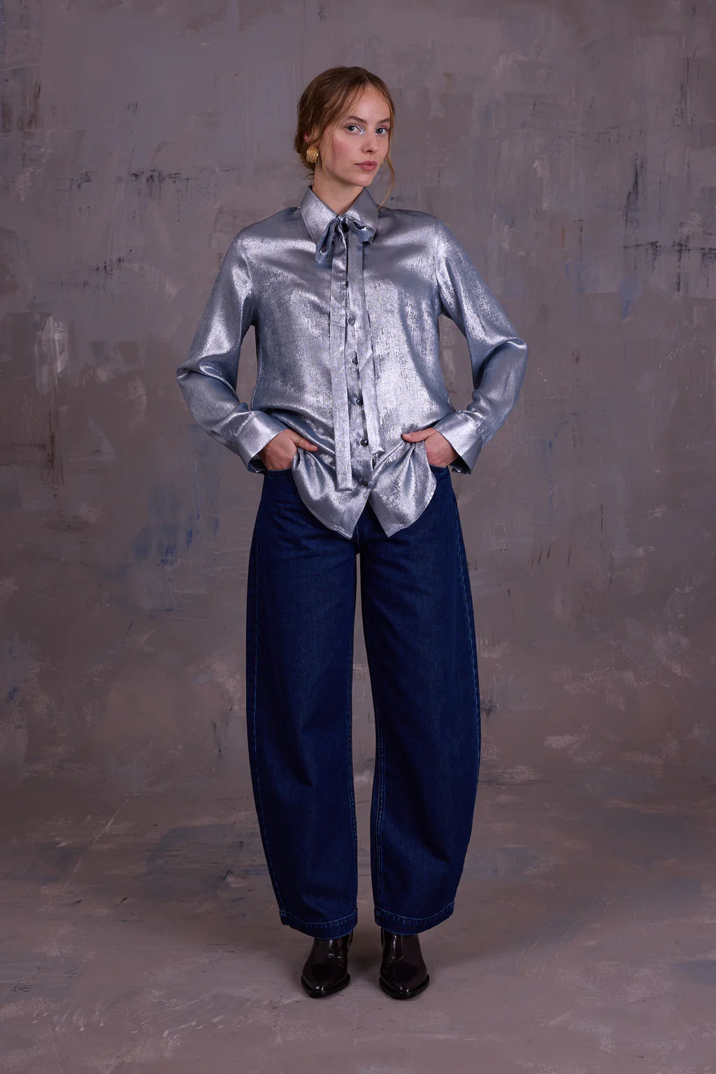 Recht hemd met een fijn lint dat je kan inzetten als strik, sjaal of riem. Uitvoering in een glanzende stof die heerlijk soepel is, een plezier om te dragen.