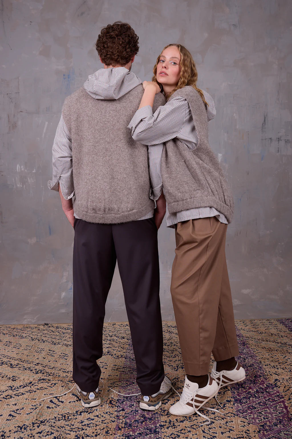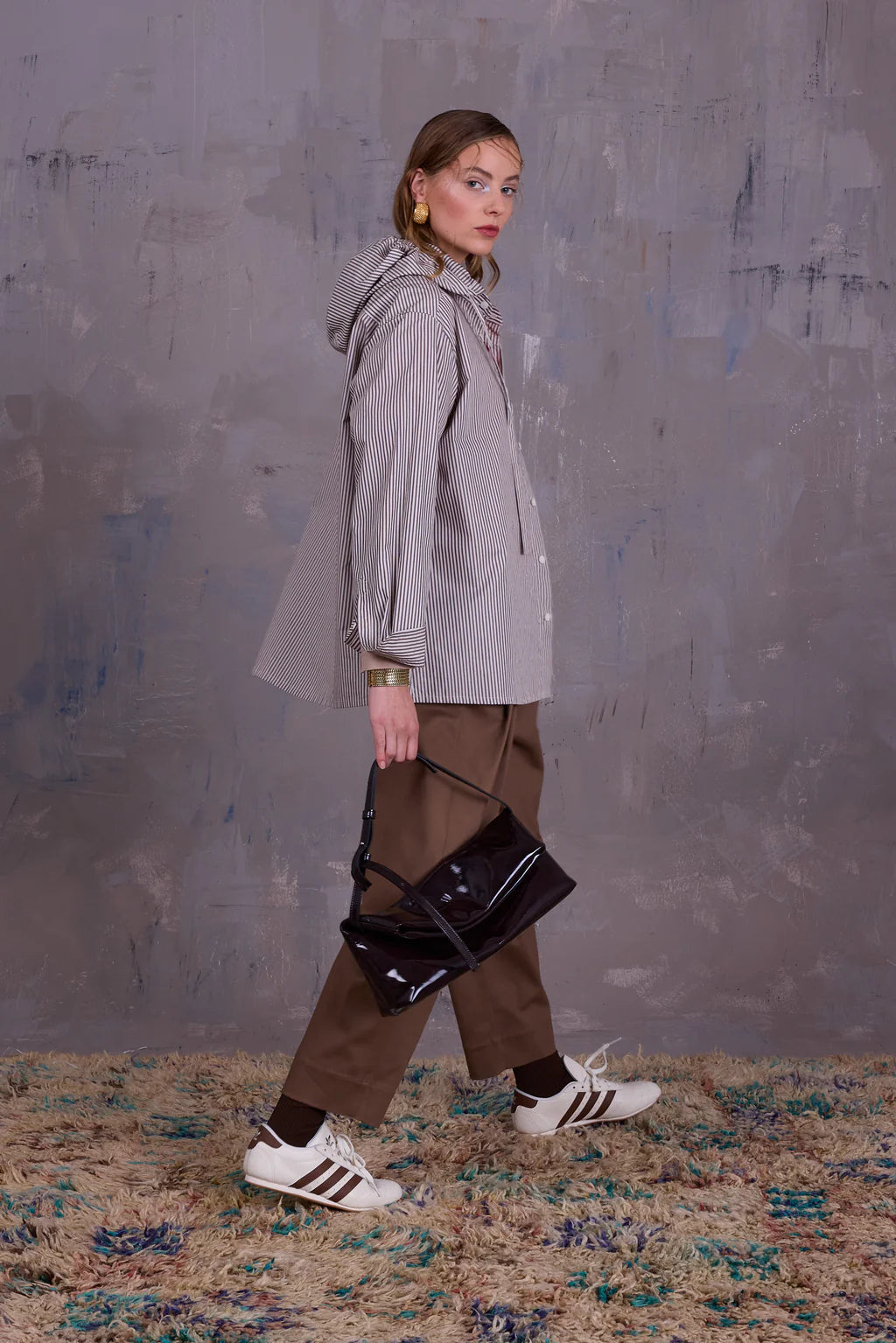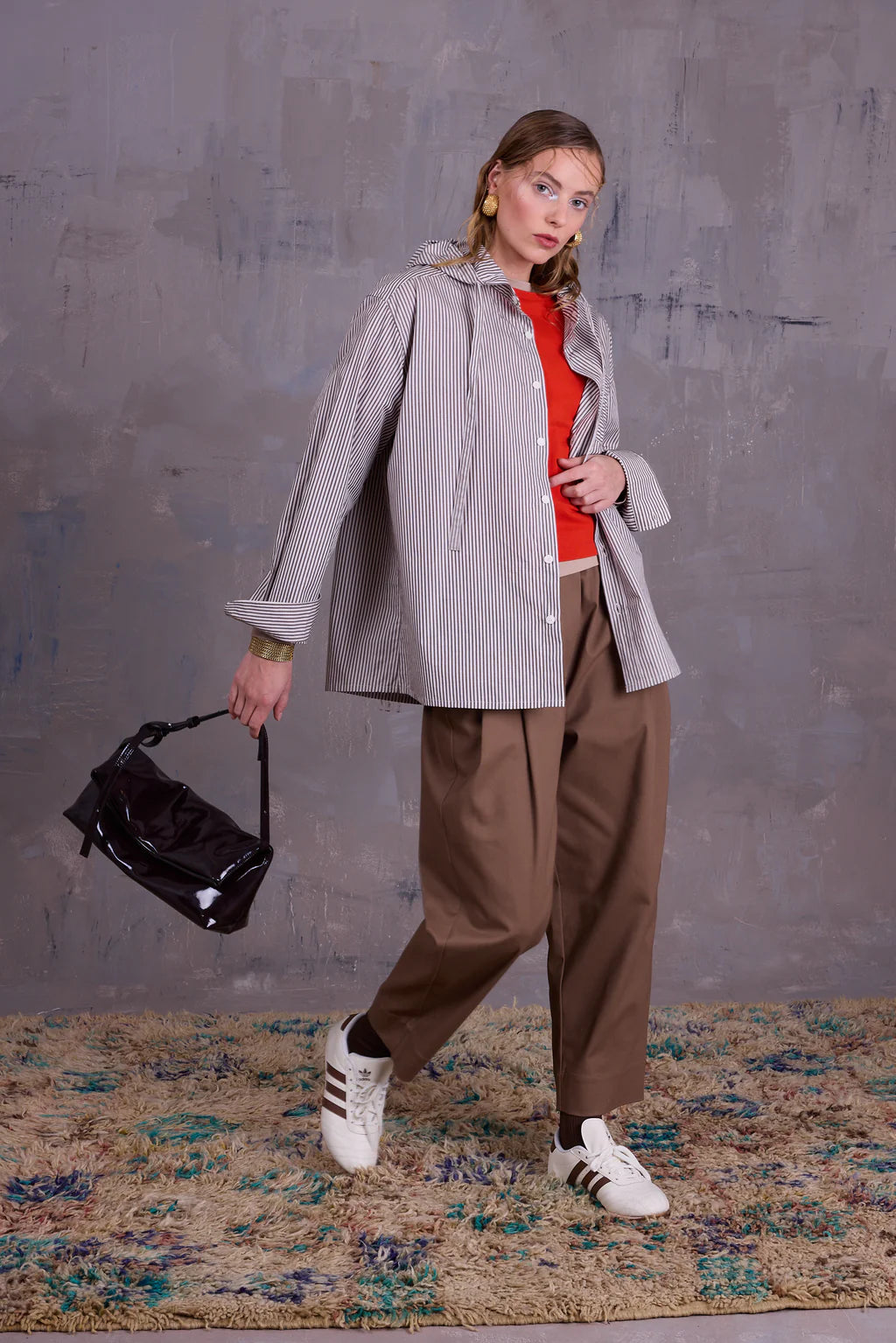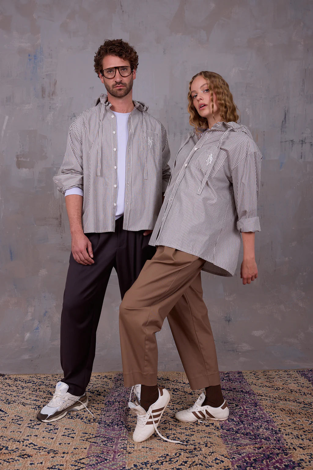 Gonzola is niet het zoveelste hemd in een dozijn. Met zijn uniseks, losse pasvorm en kenmerkende kap onderscheidt het zich qua pasvorm, maar ook de stof is bijzonder. Het is gemaakt van vintage cotton stripes, een katoenen stof met preppy cool allures, die nog meer versterkt worden door het zwierige geborduurde NV-embleem op de borstzak.