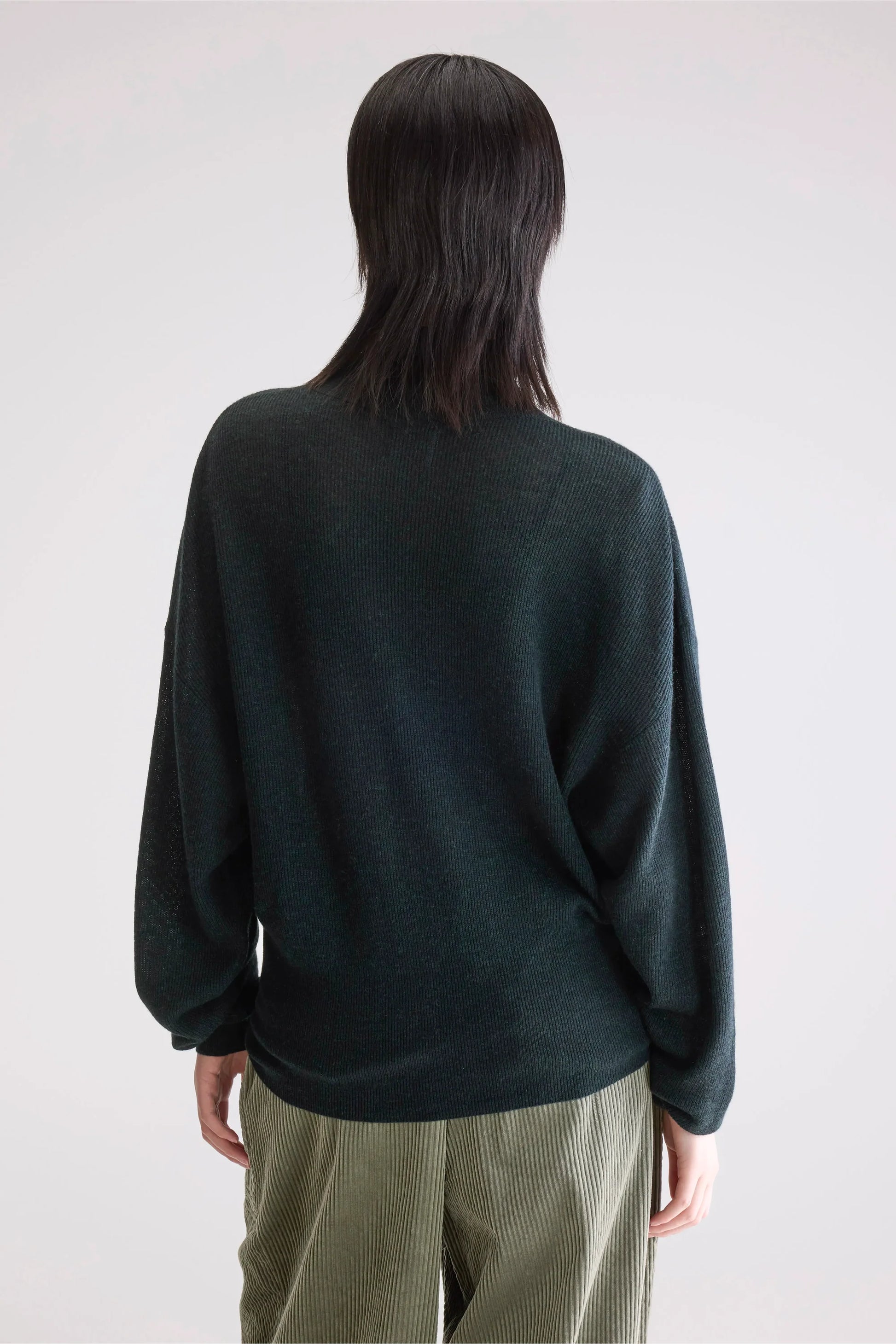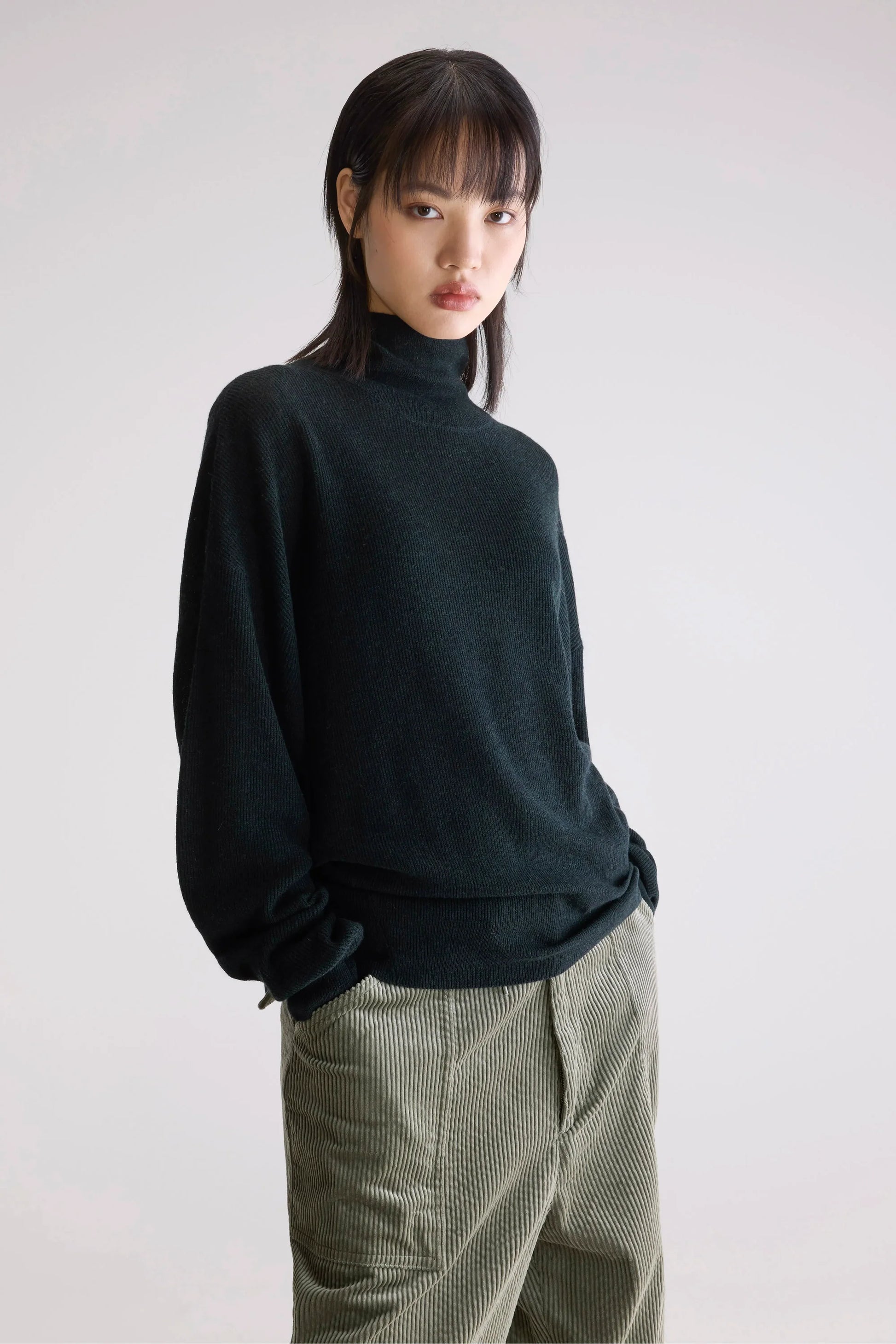 Deze relaxte gebreide trui in donkergroene wol is ontworpen voor ultiem comfort en stijl. Met een nonchalante pasvorm, lage schouders en een warme turtleneck straalt dit ontwerp moeiteloze elegantie uit. De parelsteek en verfijnde naden geven de trui een subtiel en tijdloos karakter – een veelzijdige knit die je seizoen na seizoen draagt.