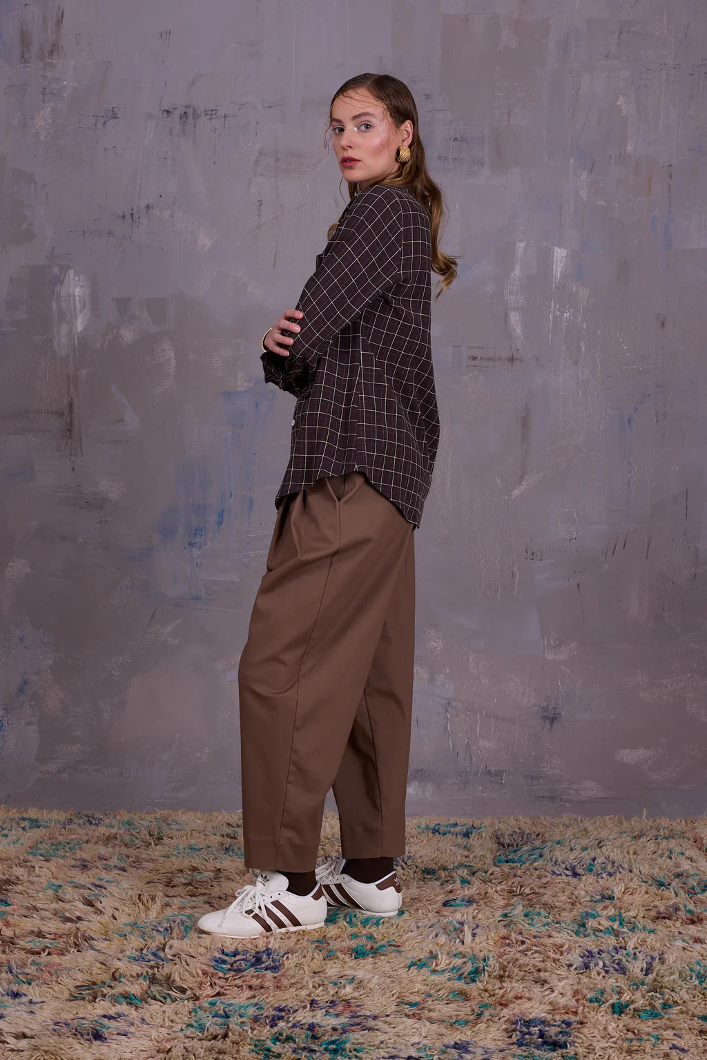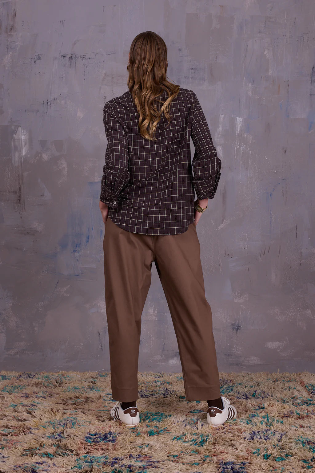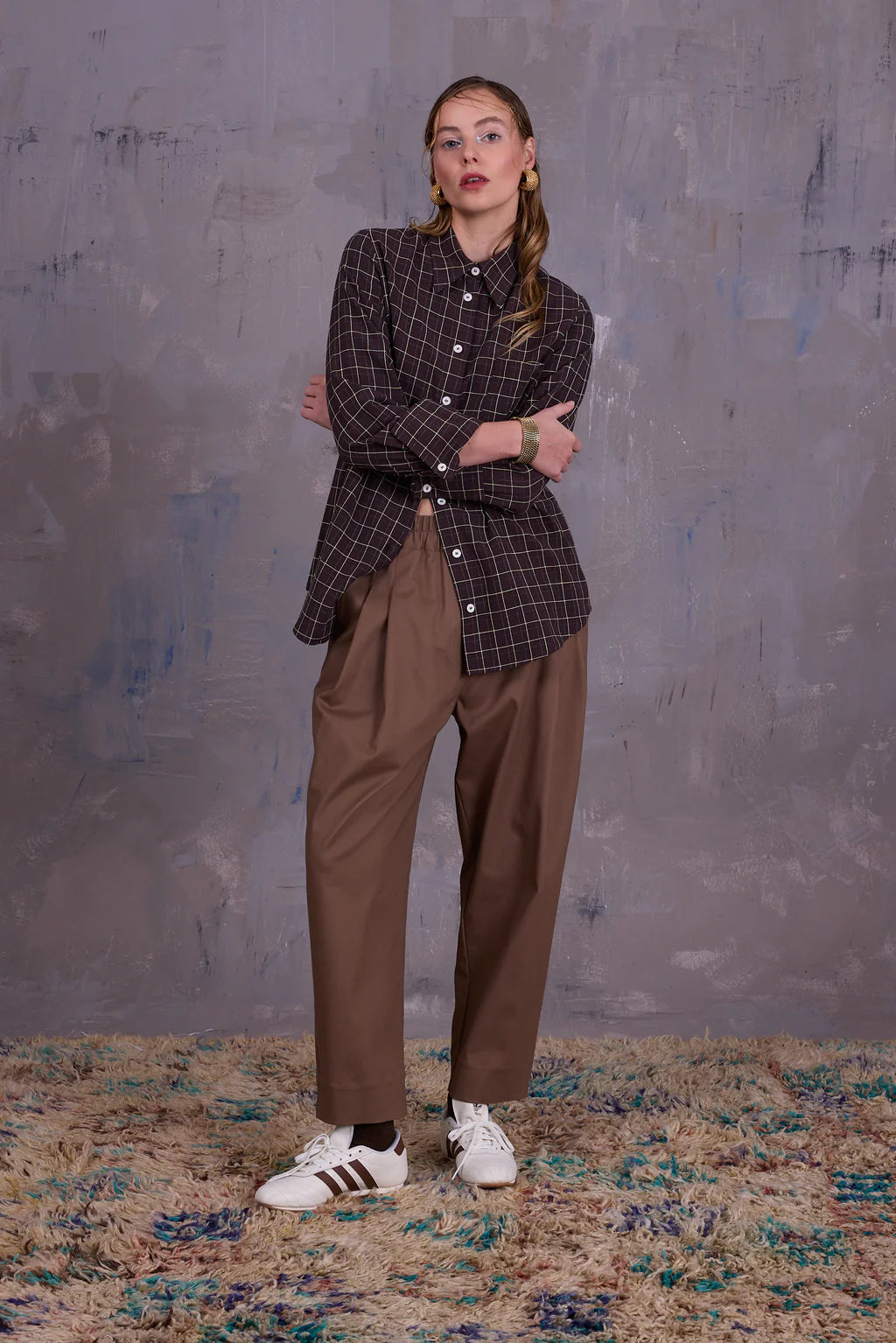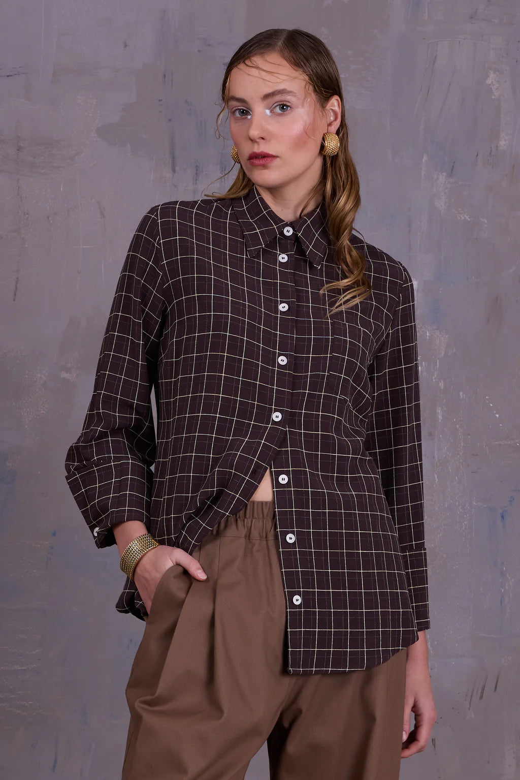 Getailleerd hemd met puntige kraag en royaal breed manchet. Het perfecte hemd om je outfit wat meer karakter te geven. Uitvoering in bruine viscose met warm beige ruitjes die voor textuur in de stof zorgen.