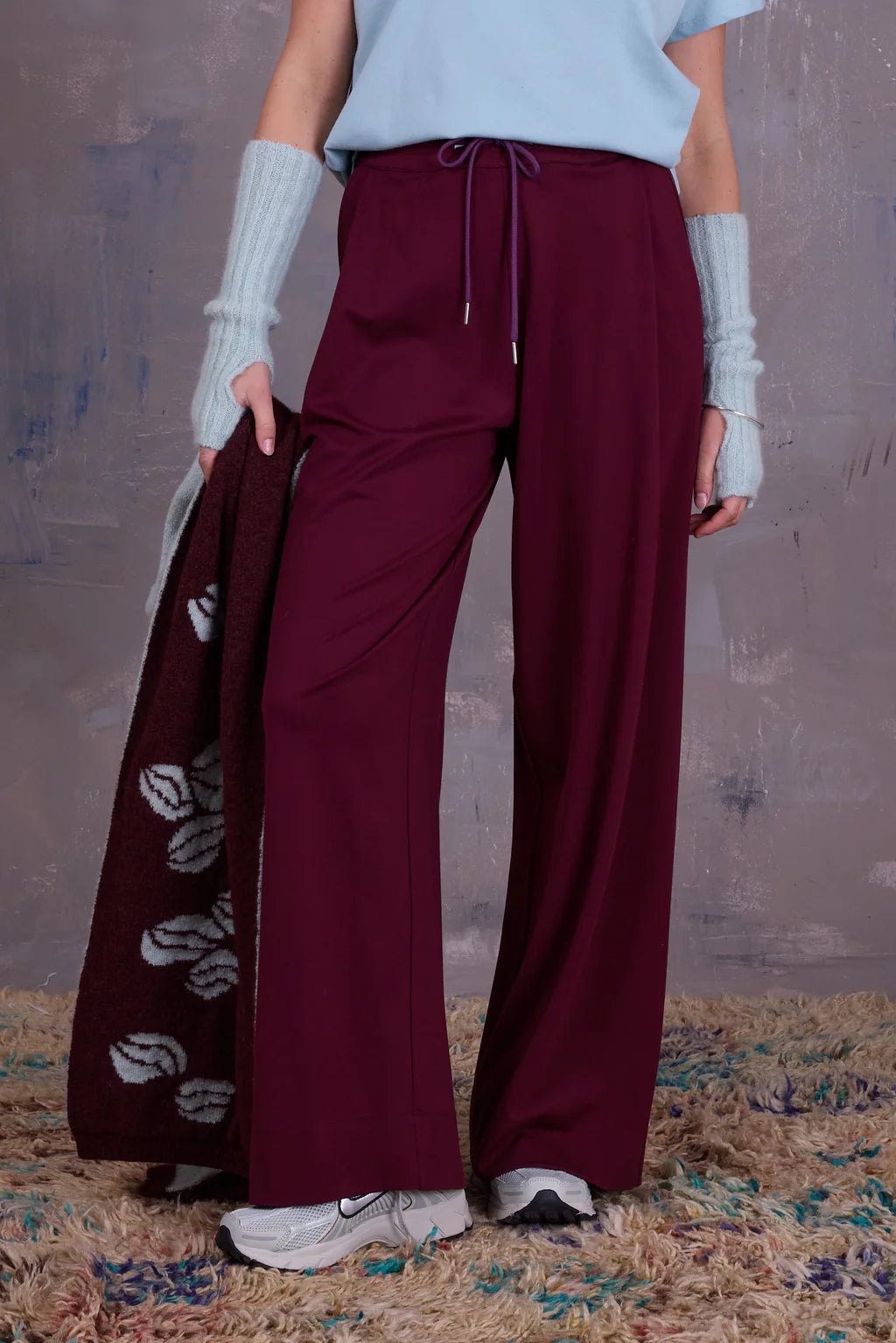 Brede broek in zware jersey met brede elastische tailleband, stroplint en een subtiele bandplooi. Ga voor een full-look in combinatie met sweater Gertruda.