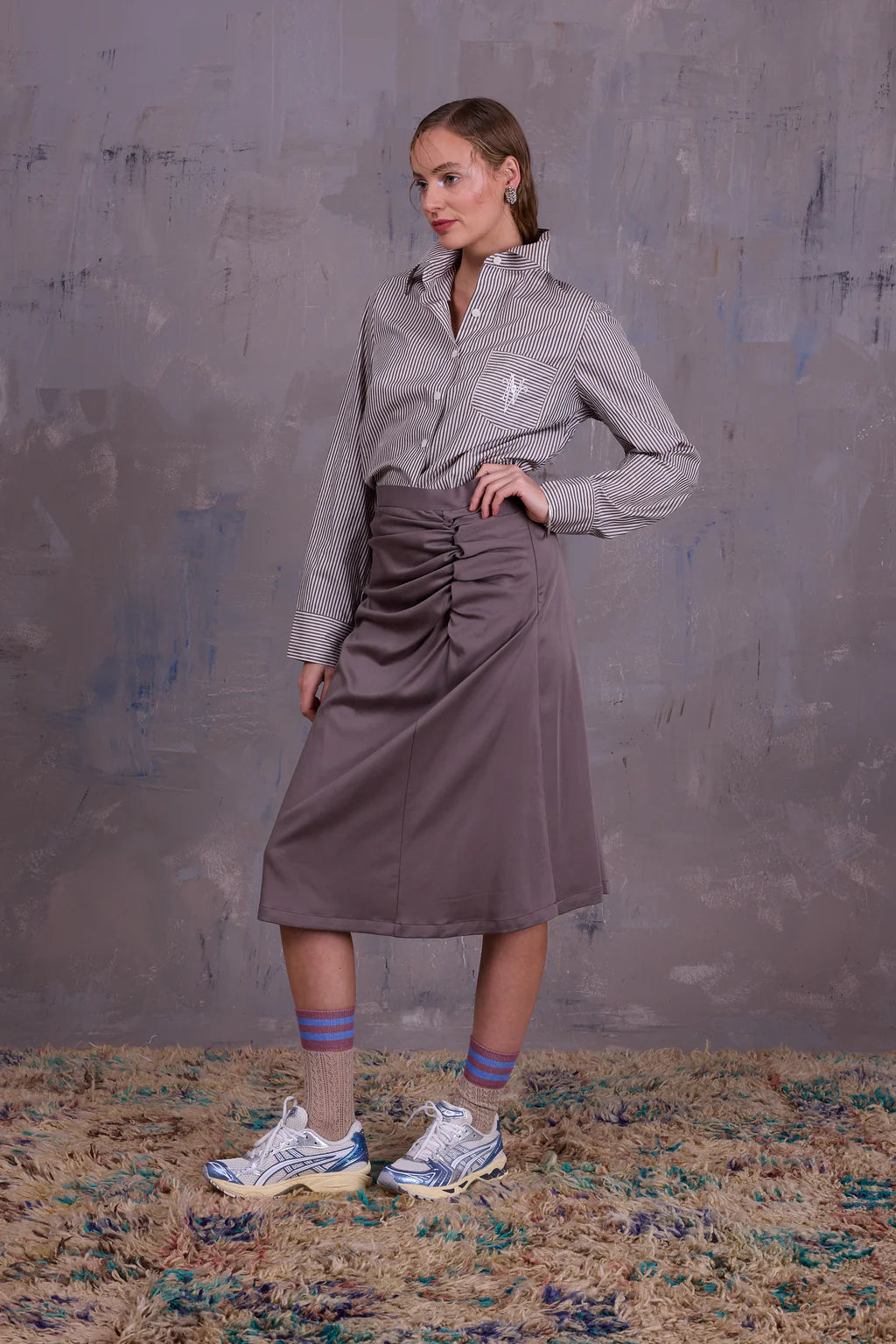 Bij Ginny draait het allemaal om de details: een geborduurd logo op het borstzakje en een knoopsluiting waar normaal gezien de mouwnaad loopt, bepalen het unieke karakter. Het hemd is gemaakt in vintage cotton stripes, een katoenen stof met preppy cool allures.