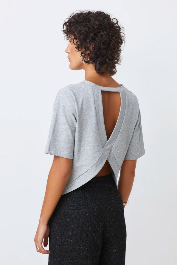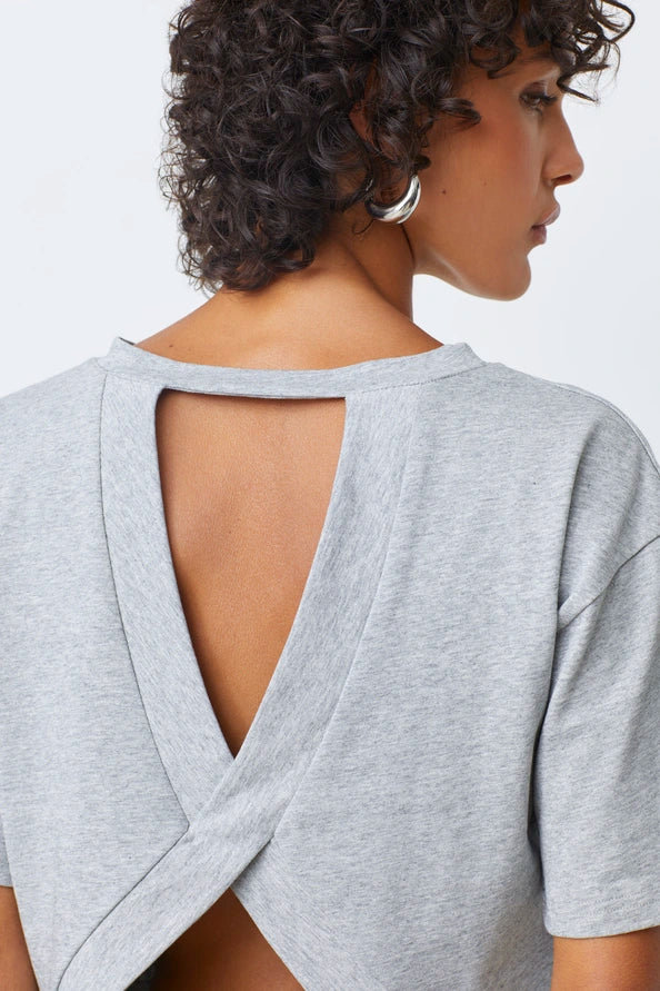 Gemêleerd grijze T-shirt van 100% biologisch katoen heeft een tijdloos design met een moderne twist. Het ronde halsje en de korte mouwen zorgen voor een casual uitstraling, terwijl de gekruiste open rug het geheel een onverwachte, vrouwelijke touch geeft. Een duurzame essential die eenvoud en stijl perfect combineert.