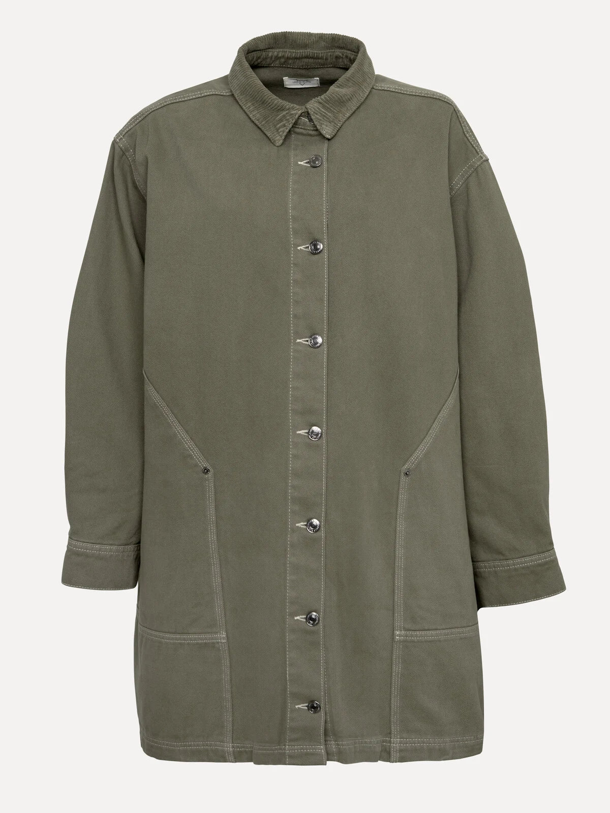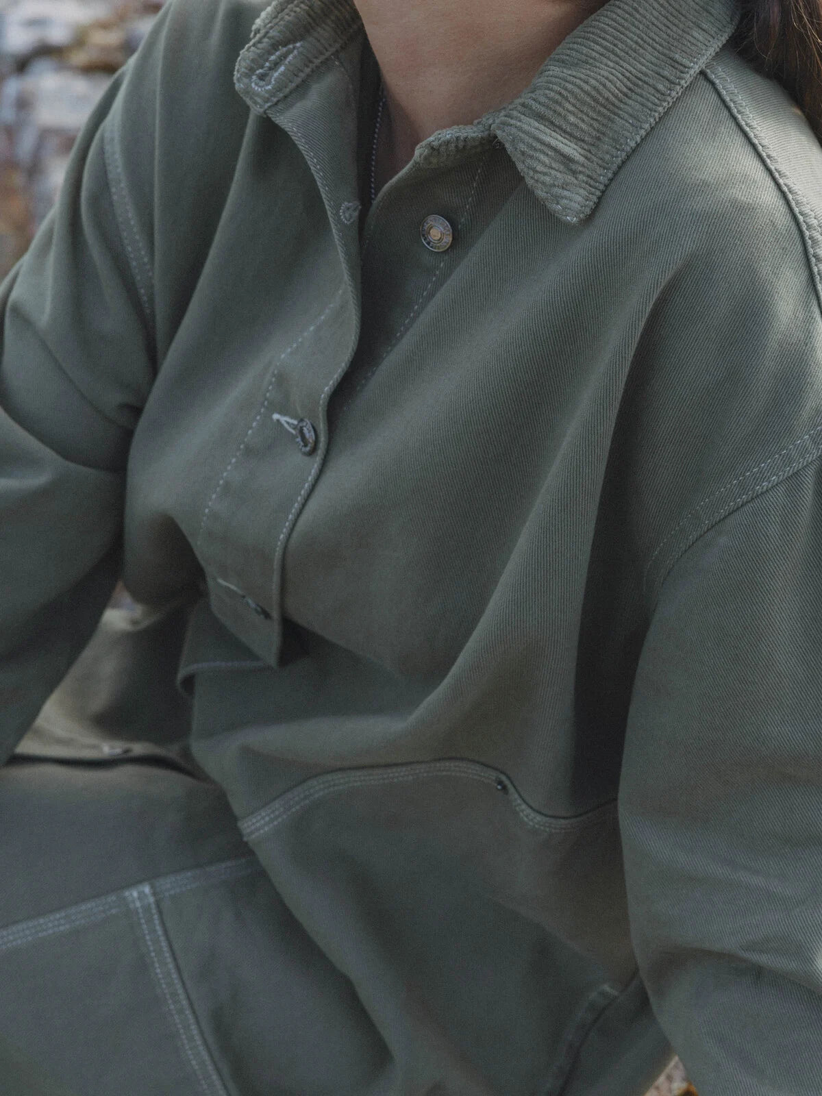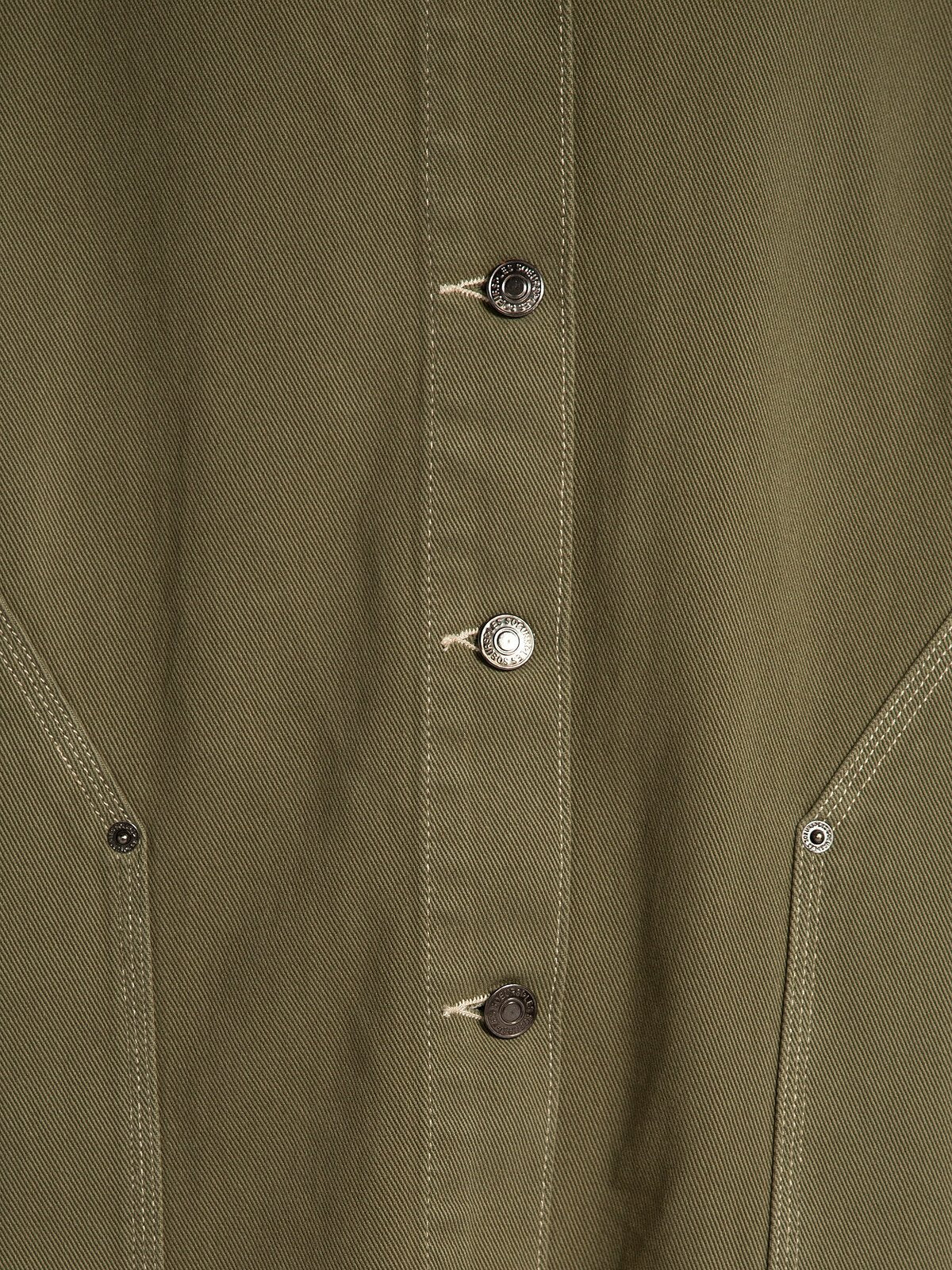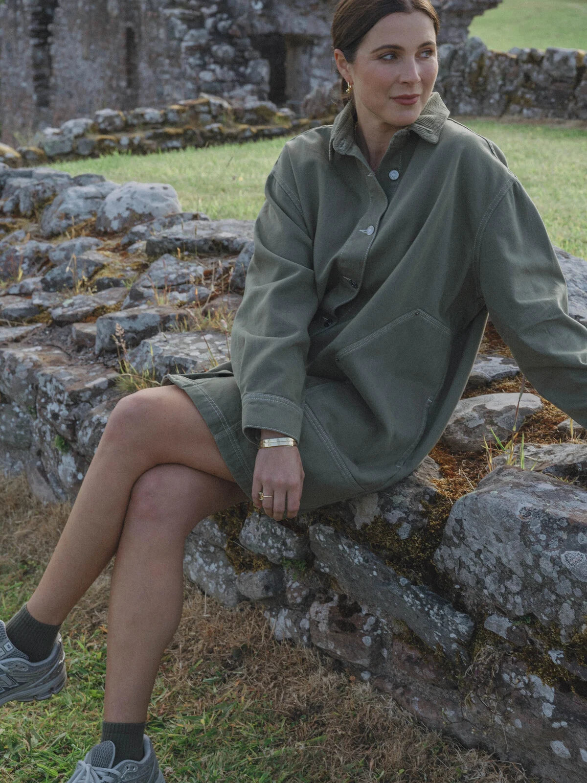 Cool met een zachte twist. Deze korte khaki jurk met contrasterende stiksels combineert workwear-invloeden met een vrouwelijke feel. Speels en stoer tegelijk. Draag met sokken en je favoriete sneakers voor een speelse herfstlook.