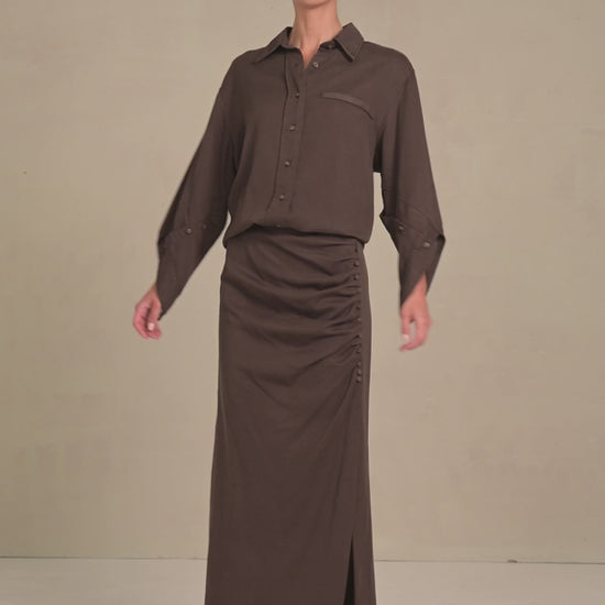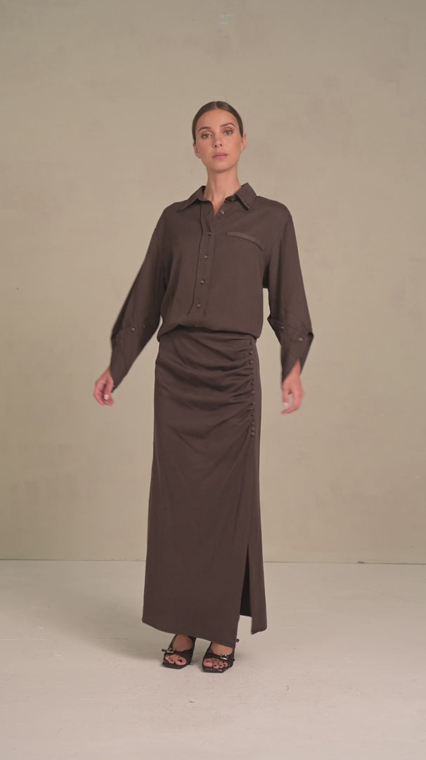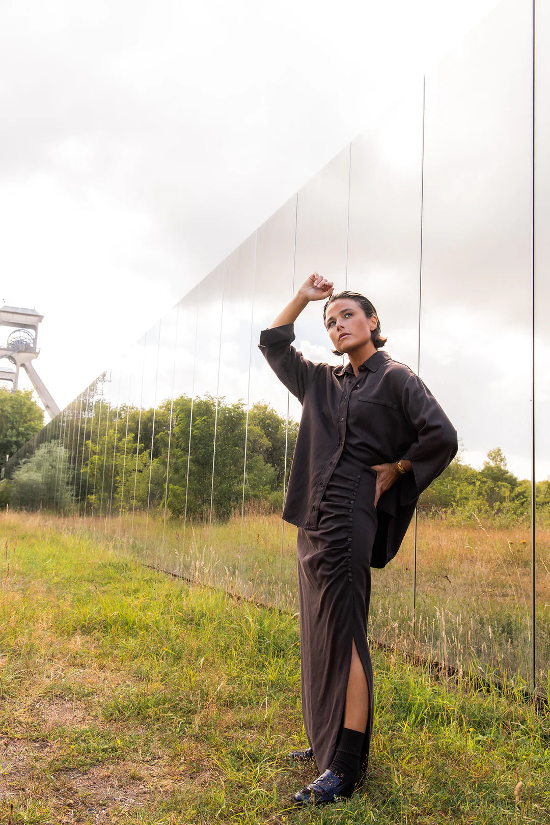 De Constanza rok heeft een lang, recht silhouet met plooien en knoopdetails. Een split aan de voorkant voegt een elegante touch toe. Perfect te combineren met de Giulia blouse of meer casual te stylen met een knit, zoals de Ami pull.