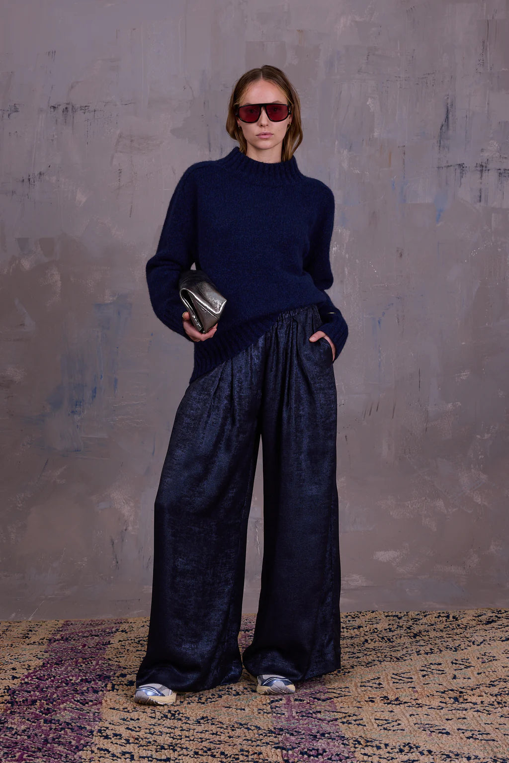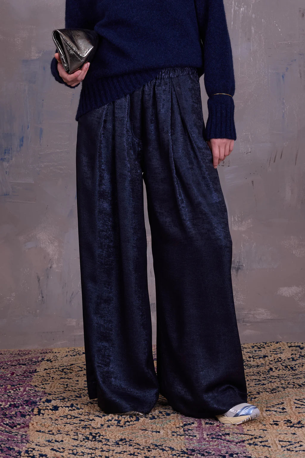 Volumineuze broek met plooien en brede elastische tailleband. Vorig seizoen in een mum van tijd uitverkocht en daarom dit seizoen geherintroduceerd in nieuwe stoffen en kleuren.