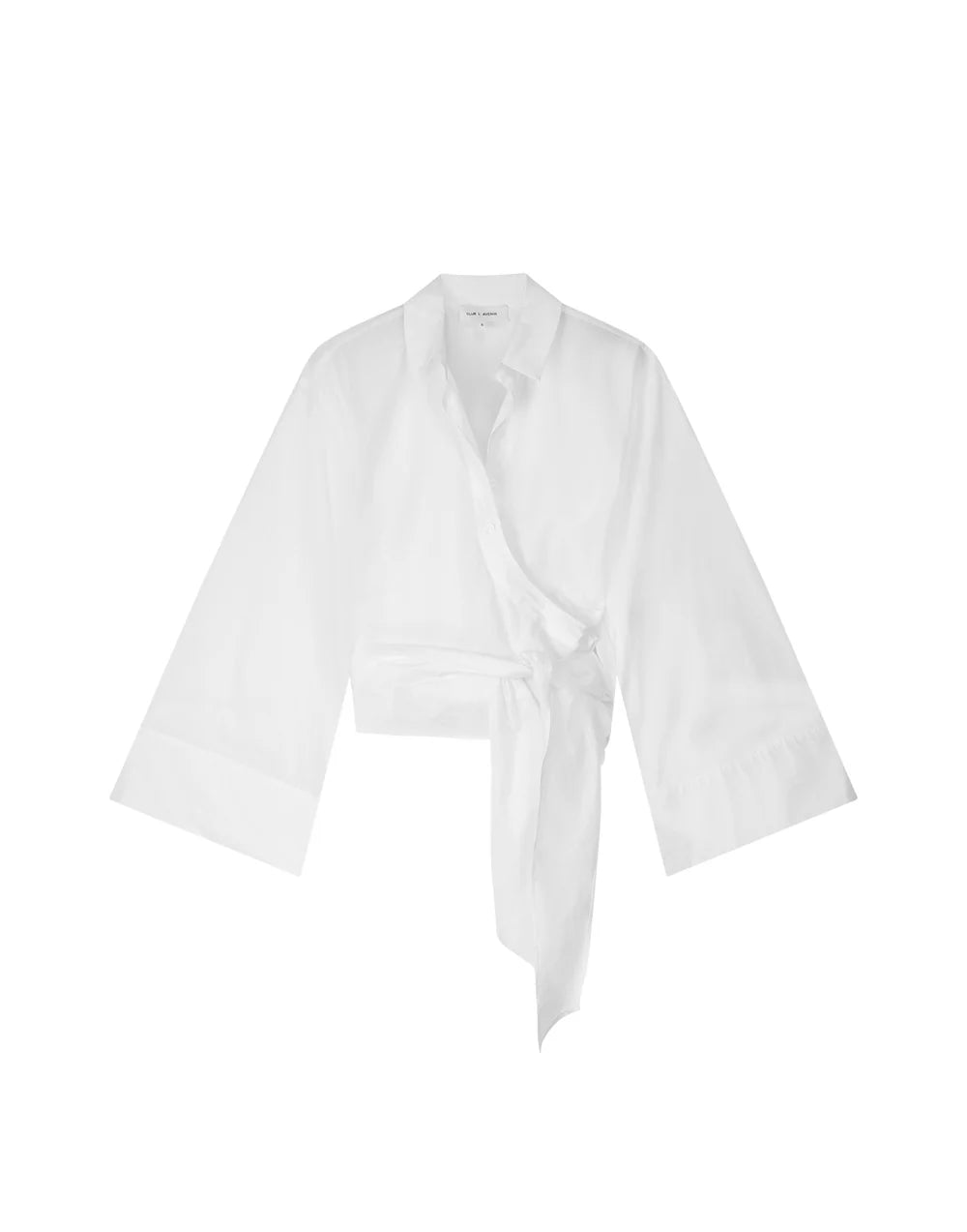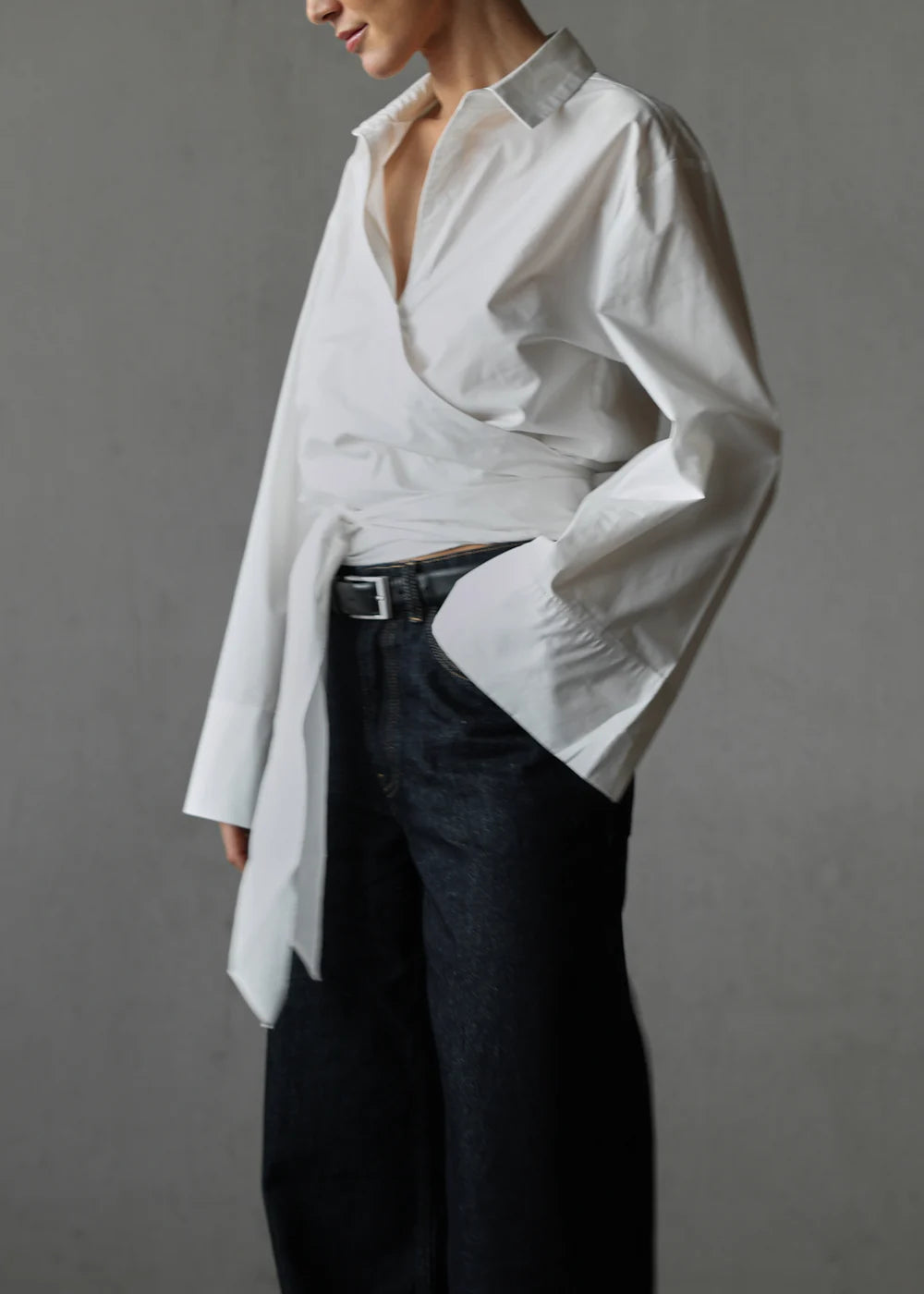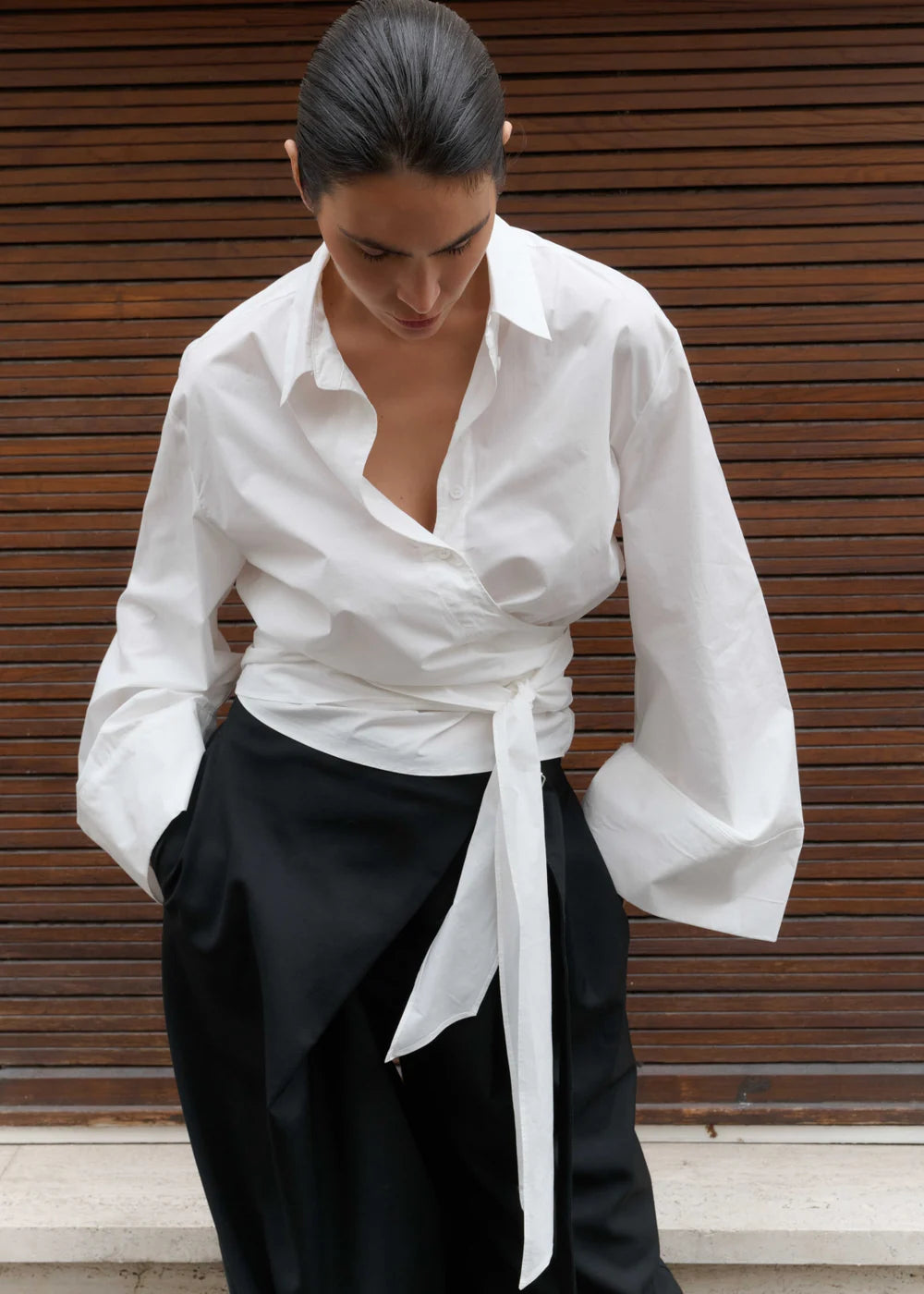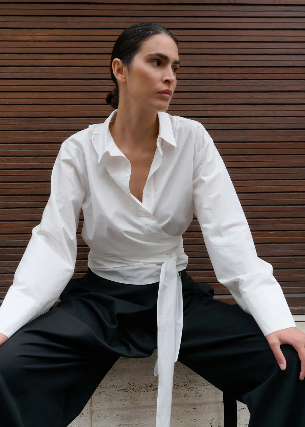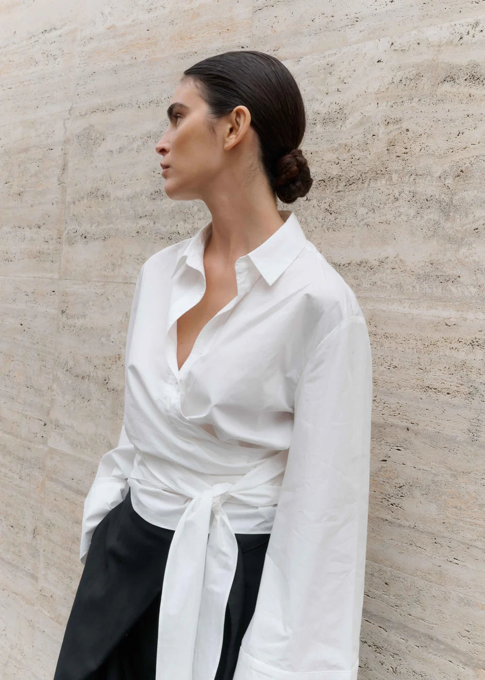 Gemaakt van ademend, natuurlijk katoen. Deze blouse wikkelt elegant om de taille en kan gestrikt worden voor een persoonlijke pasvorm. De wijde, uitlopende mouwen geven extra volume en beweging, wat zorgt voor een sculpturale uitstraling binnen een minimalistisch silhouet.