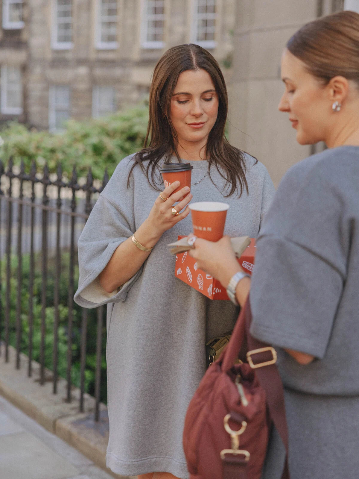 Sporty chic. Deze grijze sweater dress bewijst dat comfort en stijl hand in hand gaan. De relaxte fit en zachte stof maken dit een veelzijdig stuk, dat zowel werkt met onze Ruby sokken en sneakers als met chunky boots voor een stoerdere touch.
