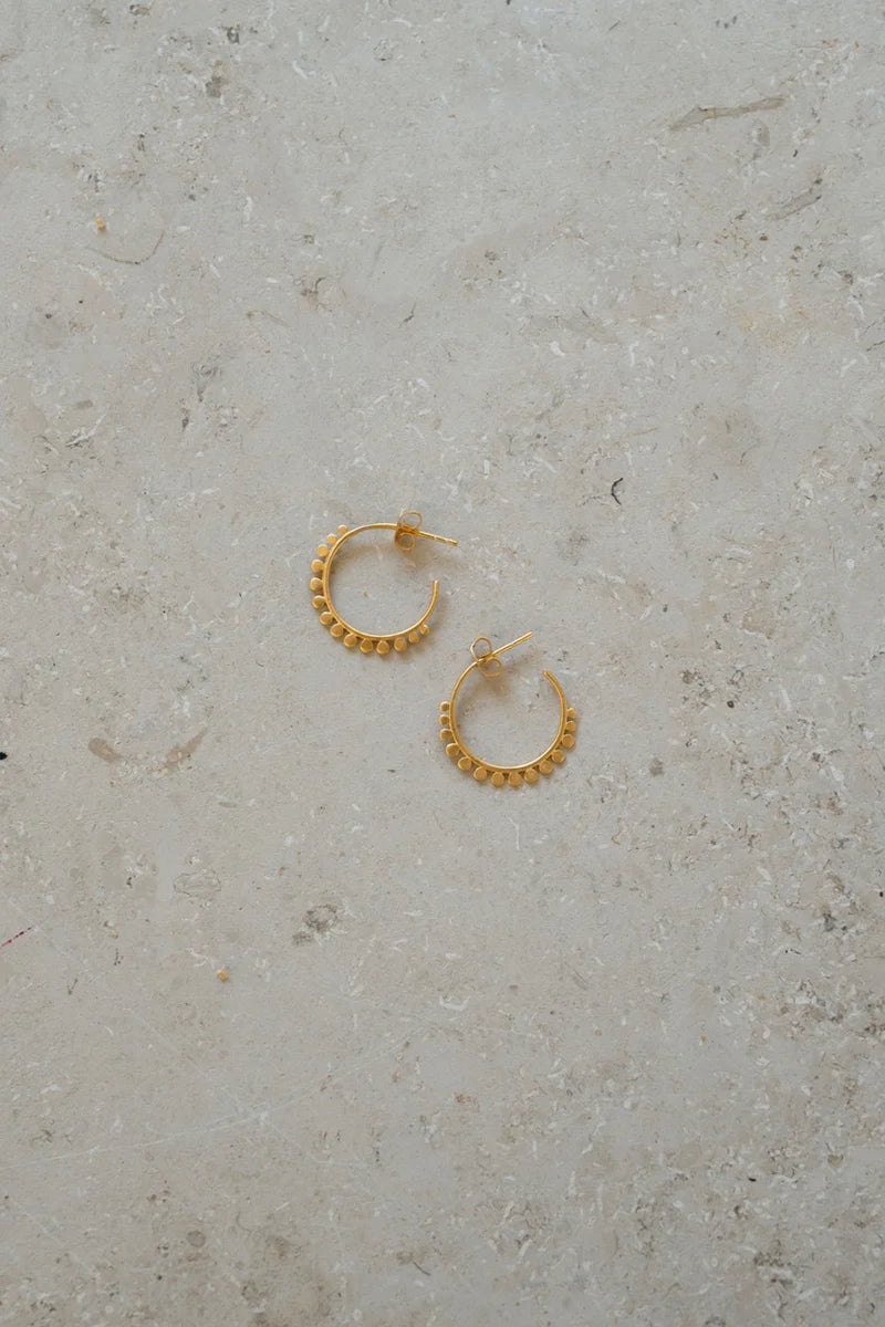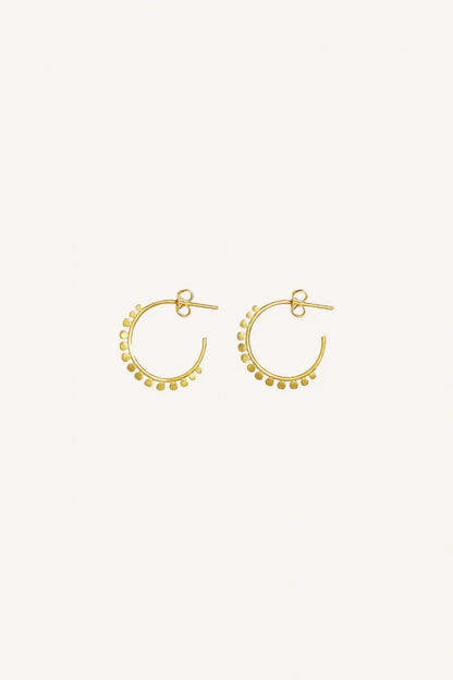 Aan de pd lara earring zitten kleine spikes wat de oorbellen een vlotte en zomerse uitstraling geeft. De oorbelllen zijn gemaakt van koper met verguld goud.De oorbel is2 cm en wordt verkocht als set.